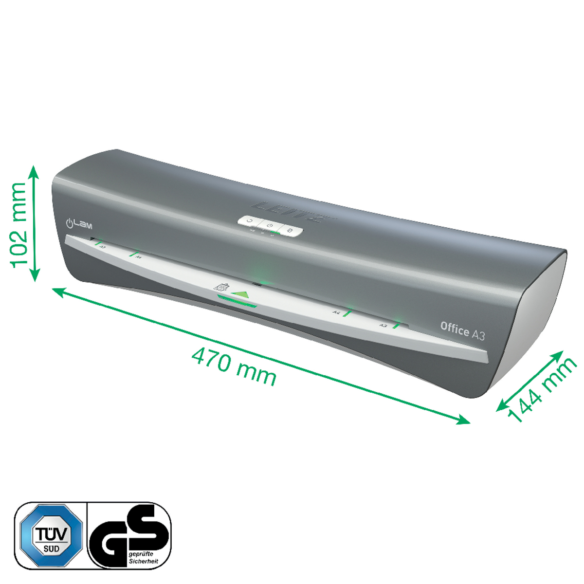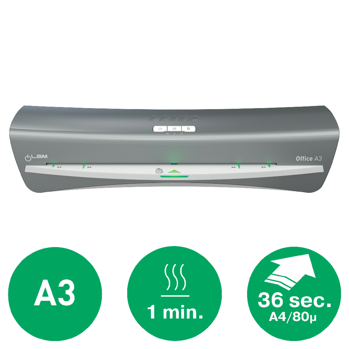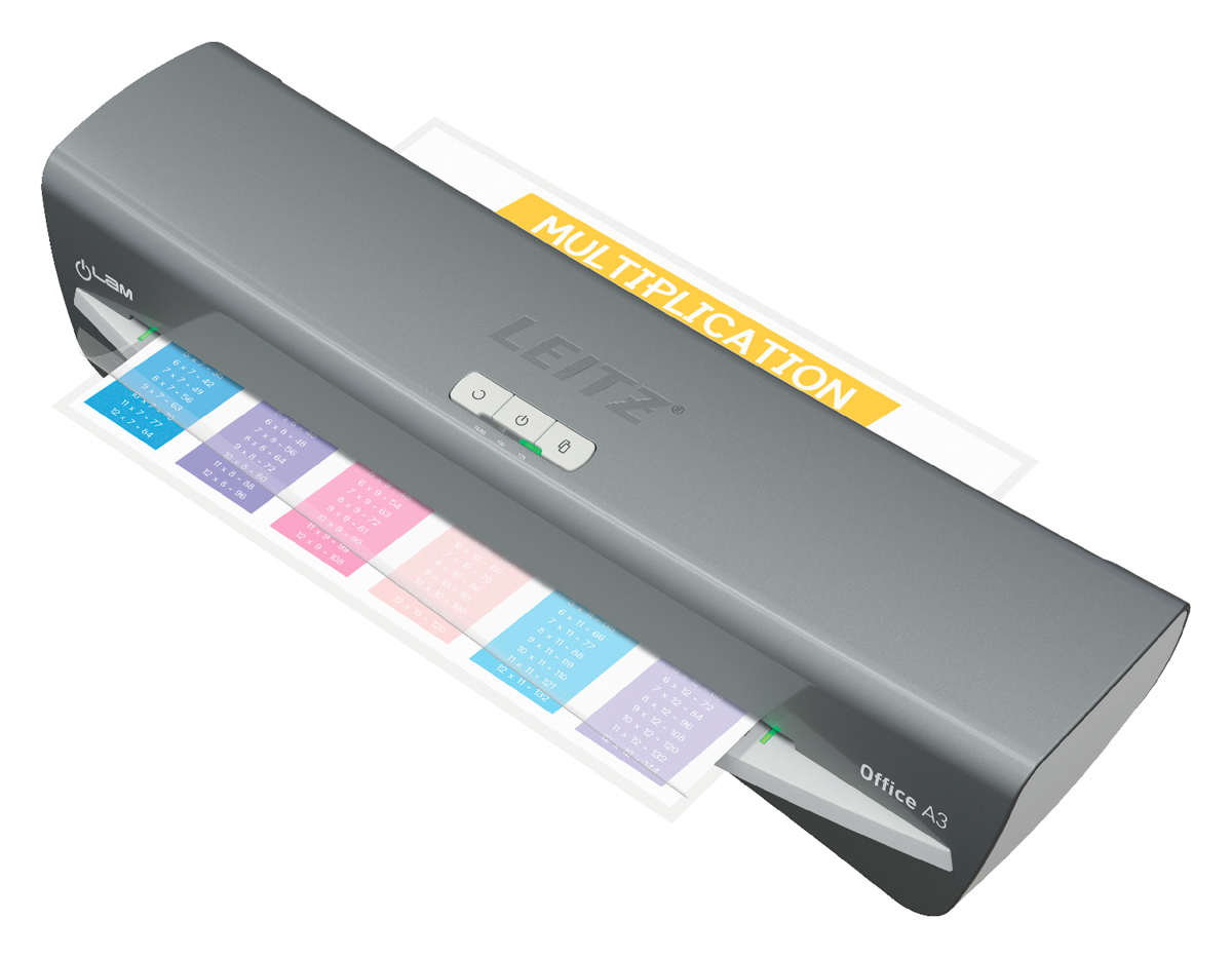 Moderný a kompaktný laminovací prístroj Leitz iLAM Office spája štýl a efektivitu. Tento laminátor vo formáte A3 garantuje ľahké laminovanie, vyznačuje sa rýchlym intervalom zahrievania len za 1 minútu, dokument A4 v 80-mikrónovej kapse na laminovanie zalaminuje už za obyčajných 36 sekúnd. Pomocou intuitívneho dotykového panelu si môžete vybrať jedno z troch nastavení hrúbky vrecka, prípadne využiť tlačidlo spätného chodu pre ľahké vybratie zaseknutej laminovacej kapsy. Inovatívna stavová SMART LED dióda využíva svetelné a zvukové signály: červená dióda znamená zahrievanie, zelená so zvukovým upozornením oznamuje pripravenosť na laminovanie, blikajúca červená dióda znamená automatické vypnutie po 15 minútach nečinnosti. Navyše šikovné vstupné navádzacie LED diódy zabezpečujú dokonalé vyrovnanie vrecka tak, aby sa zabránilo jeho zaseknutiu. Určené na kapsy od 75 do 125 mikrónov. TUV/GS, CE certifikácia. Šedá a biela farba.