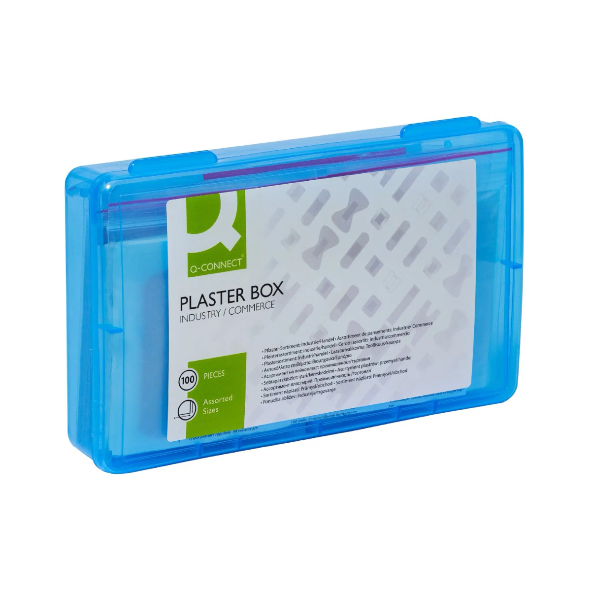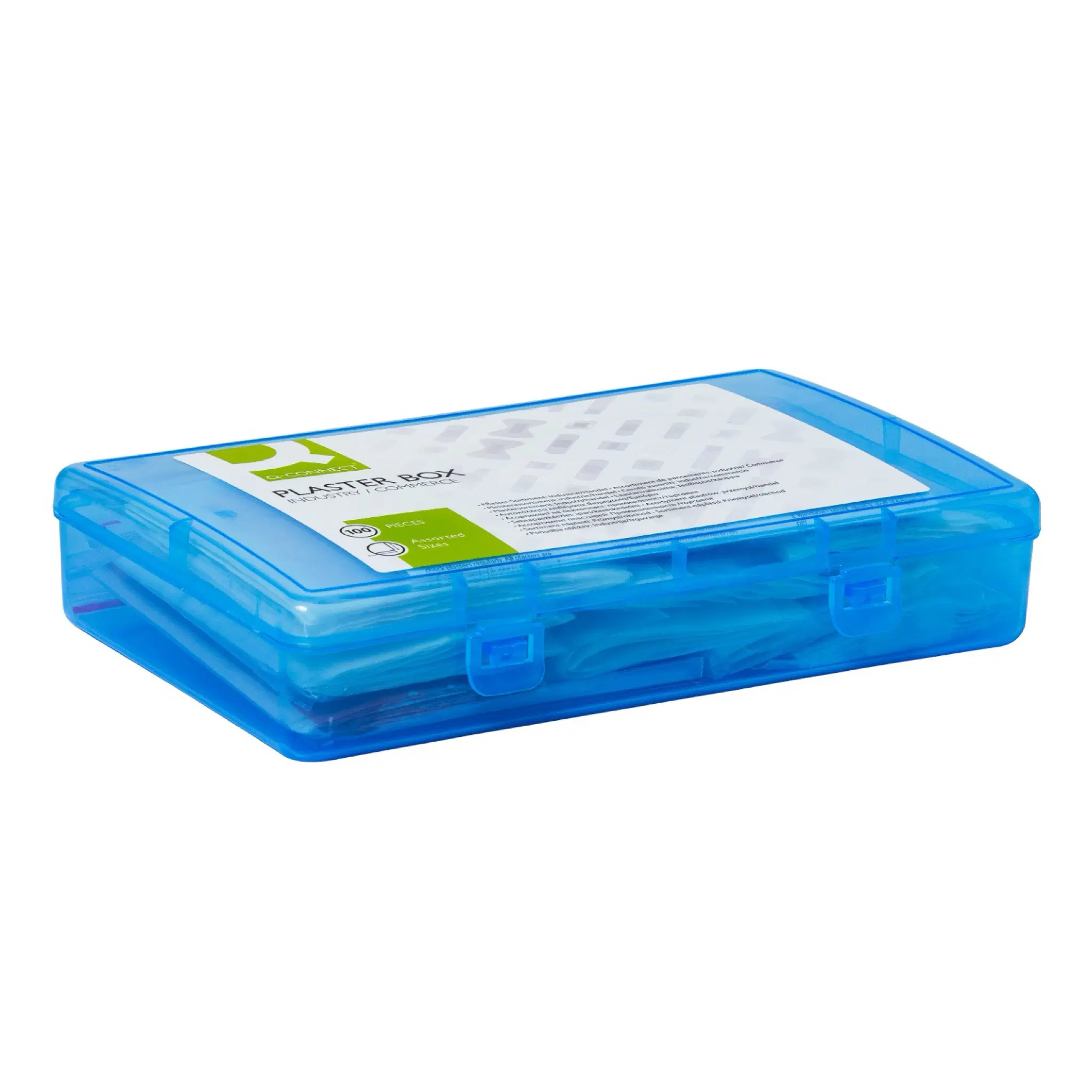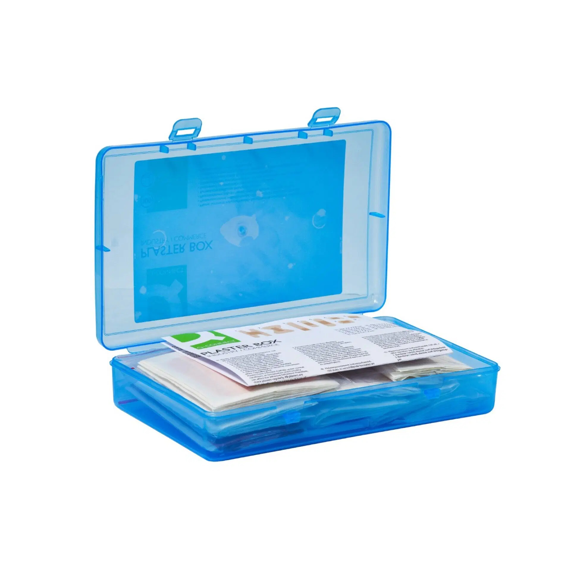 Ideálne na drobné poranenia v reštauráciách a obchodných prevádzkach. Praktická, uzatvárateľná plastová krabička. Obsah: – 10 bandáží na kĺby prstov (7,5 x 4 cm) z textilnej elastickej látky. – 10 obväzov na končeky prstov (5 x 4 cm) z textilnej elastickej látky. – 10 obväzov na prsty (12 x 2 cm) z textilnej, elastickej látky. – 15 malých sadrových pásikov (1,9 x 7,2 cm) z textilnej elastickej látky. – 15 sadrových pásikov (2,5 x 7,2 cm) z textilnej, elastickej tkaniny. – 10 vodotesných oválnych náplastí (5,0 x 7,2 cm) transparentných. – 10 oválnych náplastí (5 x 7 cm) z textilnej, elastickej tkaniny. – 10 obväzov na rany (10 x 6 cm) z textilu, štandard. – 10 citlivých obväzov na rany (10 x 6 cm), biele fleece, hypoalergénne. Rozmer (ŠxVxH): 20,8 x 4,4 x 13,2 cm. Hmotnosť: 226 g. Farba: modro-transparentná