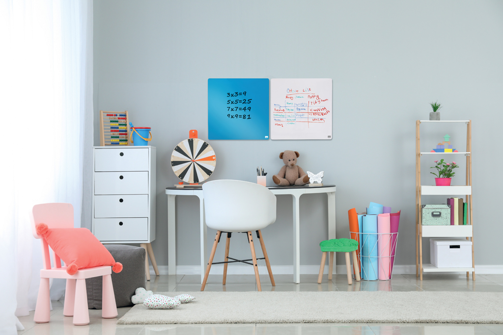 Kompaktné magnetické dielce stierateľné za sucha majú ideálnu veľkosť pre každý pracovný stôl, doma i v kancelárii. Obsahujú dva magnety, biely popisovač s mazacou hubou a montážnu penovú pásku. Farba: modrá. 360 × 360 mm.