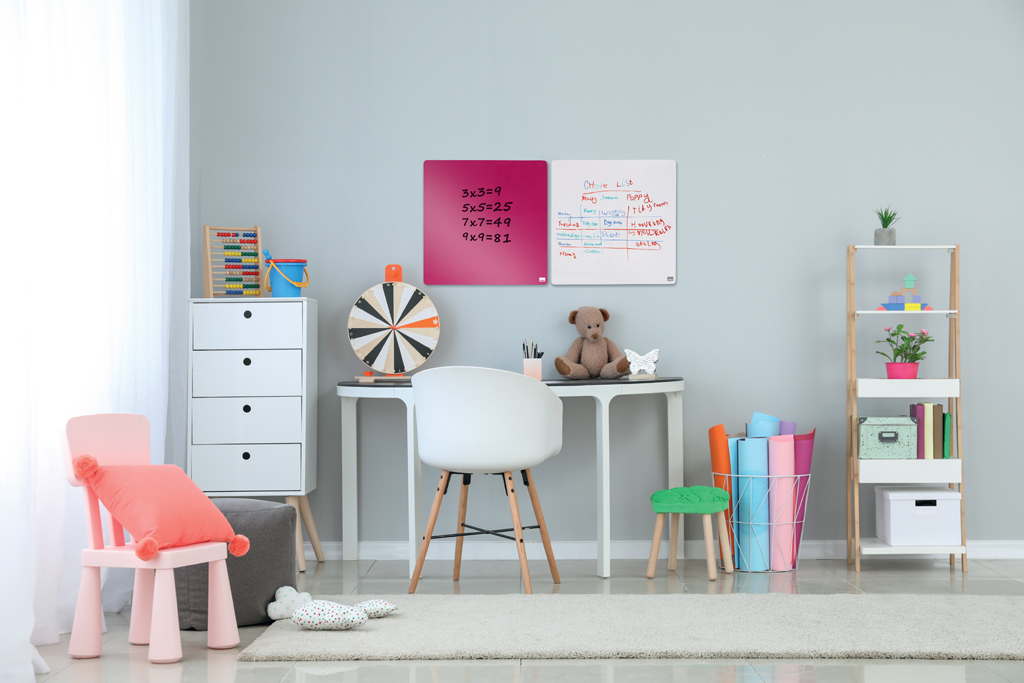 Magnetické, za sucha mazateľné tabule z bezrámčekových štvorcových dielcov Rexel. Obsahujú dva magnety, popisovač GlowWrite mazateľný za sucha, montážne magnety a penovú lepiacu pásku. Modulárny systém – dajú sa kombinovať navzájom alebo i s ostatnými nástenkami a popisovacími tabuľami Rexel. 360 × 360 mm. Farba ružová.