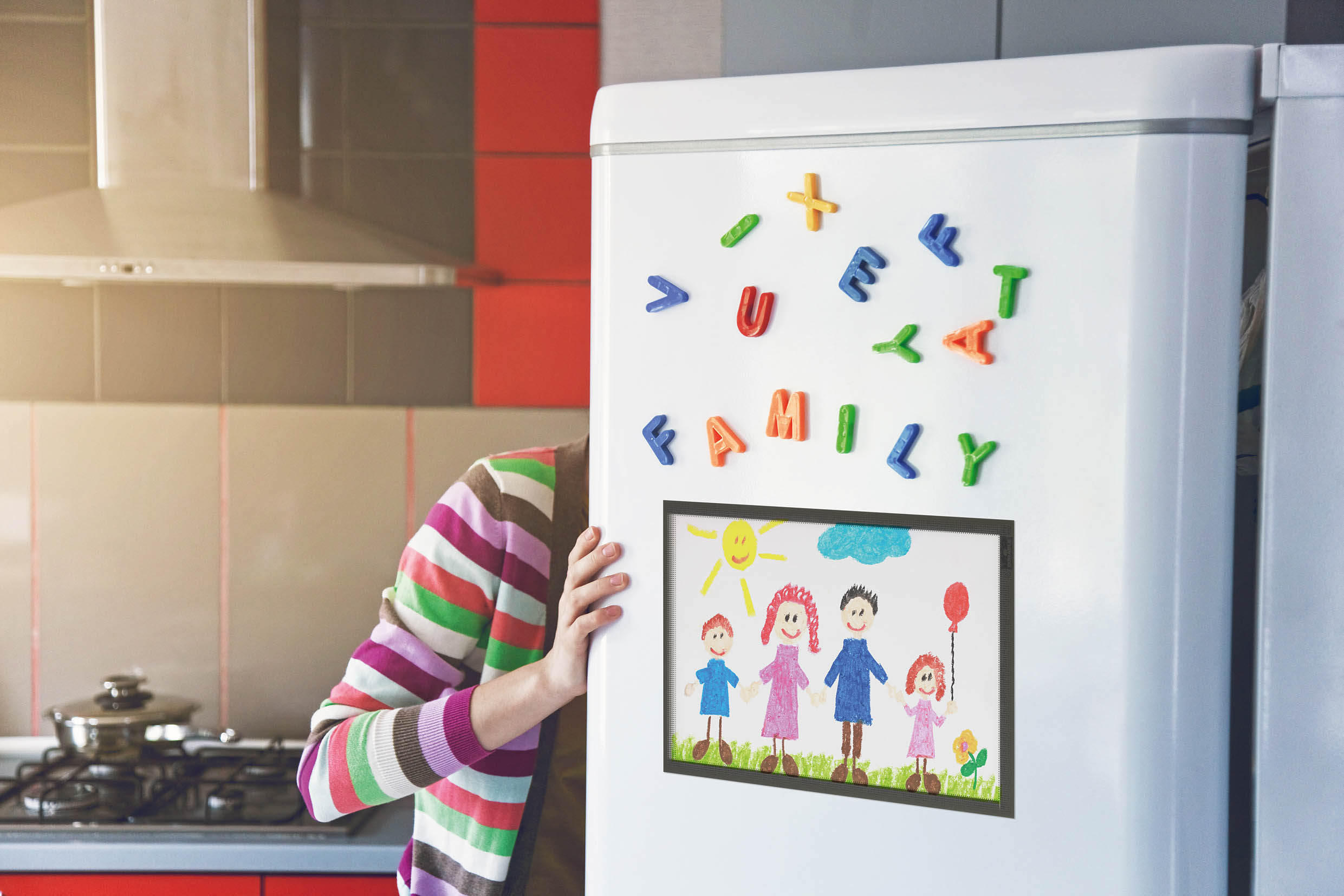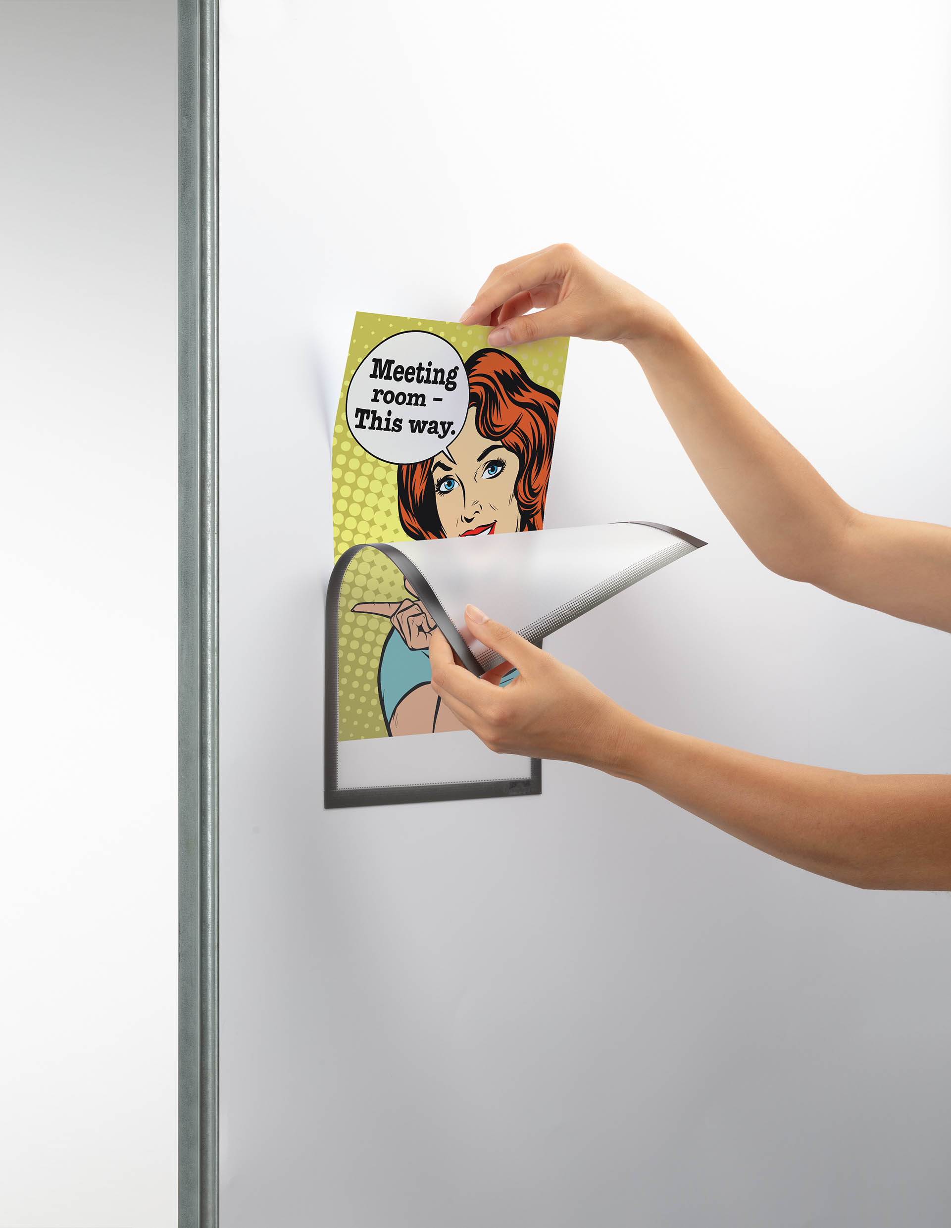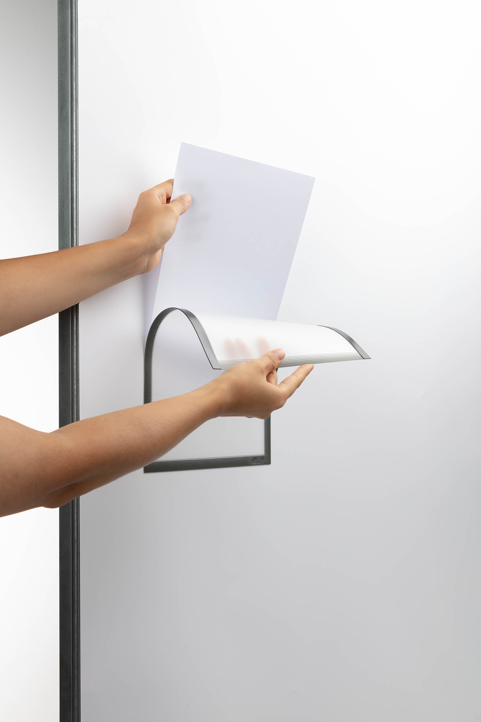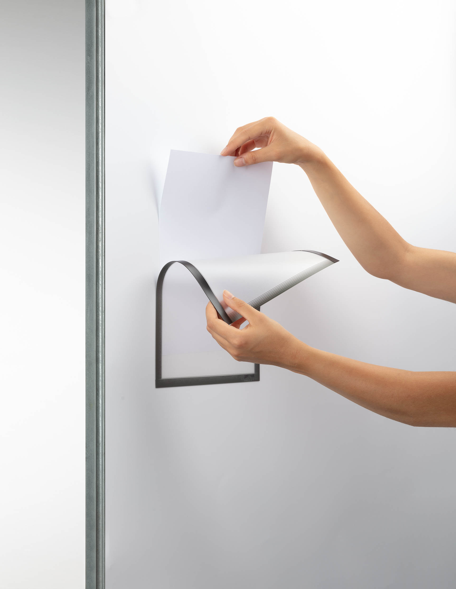 Držiak na dokumenty vo formáte A4 na pripevnenie pomocou troch magnetických pásikov na kovový podklad. Farba sivá.
