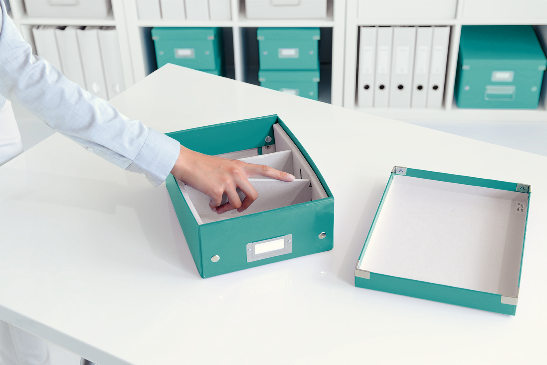 Malá štýlová skladacia krabica s vekom a s rámčekom na štítok. Na usporiadanie nabíjačiek, káblov a ďalšieho vybavenia kancelárie. Veľkosť S. Na prvý pohľad vidíte, čo sa vojde dovnútra! Výška krabice bola navrhnutá tak, aby vám poskytla dostatok priestoru na uloženie príslušenstva a zároveň zabránila skladaniu vecí na seba. Na vylepšenie usporiadania obsahu krabice použite priložený vnútorný systém priehradiek. Môžete rozdeliť krabicu na 2 alebo 3 časti a zabrániť tak miešaniu káblov alebo fotiek. Inteligentná skladacia konštrukcia: rýchle a jednoduché zloženie bez nutnosti použitia skrutiek a možnosť opätovného rozloženia na úsporu miesta, keď krabicu práve nepotrebujete. Moderný vzhľad a farby na skrášlenie vašej kancelárie alebo domova. Lesklé vyhotovenie vytvára prvotriedny vzhľad škatule a umožňuje dlhodobé používanie a jednoduché utieranie prachu. Rámček na štítok pre jednoduché označenie obsahu. Materiál pevný kartón potiahnutý polaminovaným papierom. Farba ľadovo modrá.