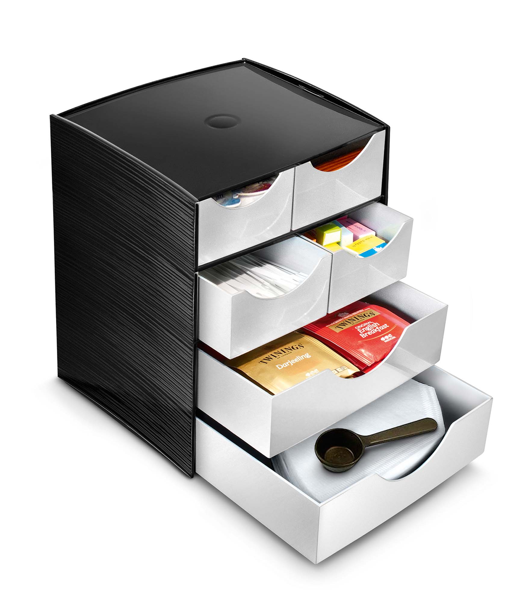 Geniálne navrhnutý a veľmi kompaktný modul so zásuvkami, ktorý si ľahko nájde svoje miesto v priestore Vašej kuchyne vedľa kávovaru alebo rýchlovarnej kanvice. Káva, smotana do kávy, čajové vrecúška, lyžičky, porciovaný cukor a papierové obrúsky nikdy neboli tak dobre organizované, aby uľahčili prípravu teplých nápojov. Rukoväte uľahčujú jednoduché otváranie zásuviek, zásuvky môžu byť v prípade potreby z modulu ľahko odstránené. Protišmykové podložky na spodnej časti modulu zabezpečujú jeho stabilitu. Vyrobený zo 100% recyklovateľného polystyrénu, ktorý je certifikovaný na bezpečnosť pre potraviny. Farba čierna/ kovová sivá. Rozmery (š × h) 185 × 183 mm, výška modulu 168 mm.