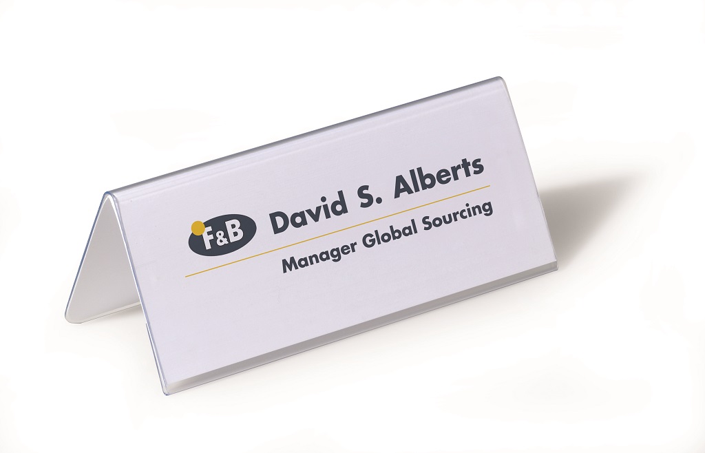 Obojstranne čitateľná stolová menovka z pevného PVC, vhodná na konferencie, recepčné pulty, ceny tovarov a popis produktov. Dodávaná s vymeniteľnou prázdnou kartou. Väčšie balenie 25 ks.