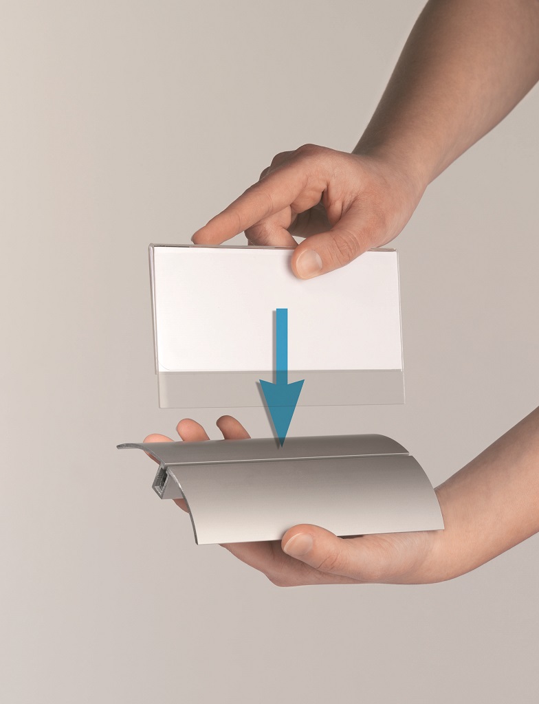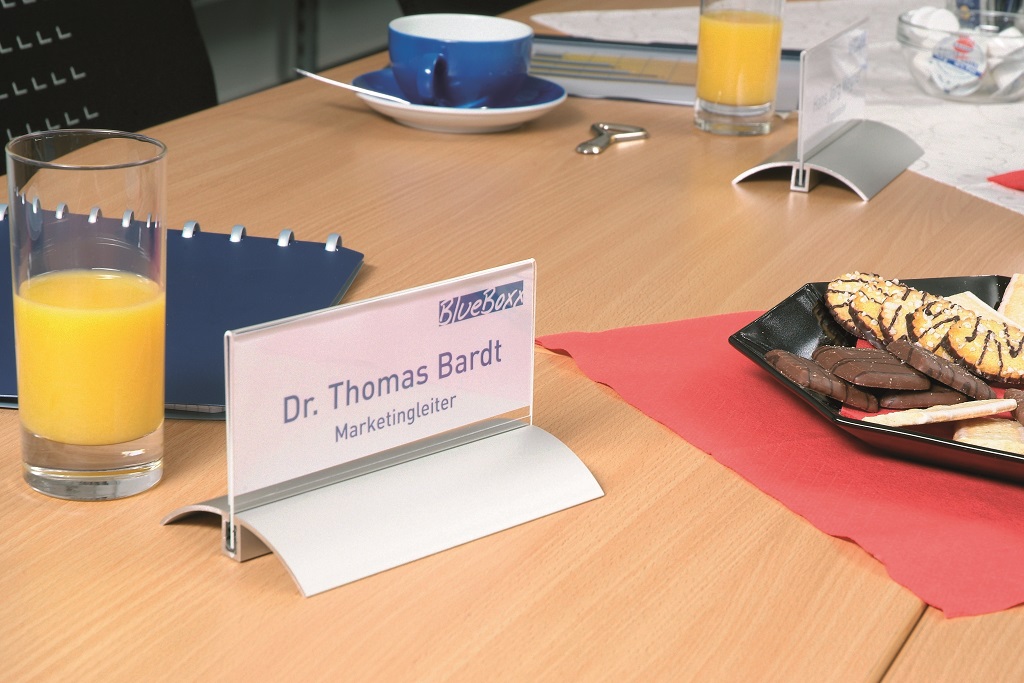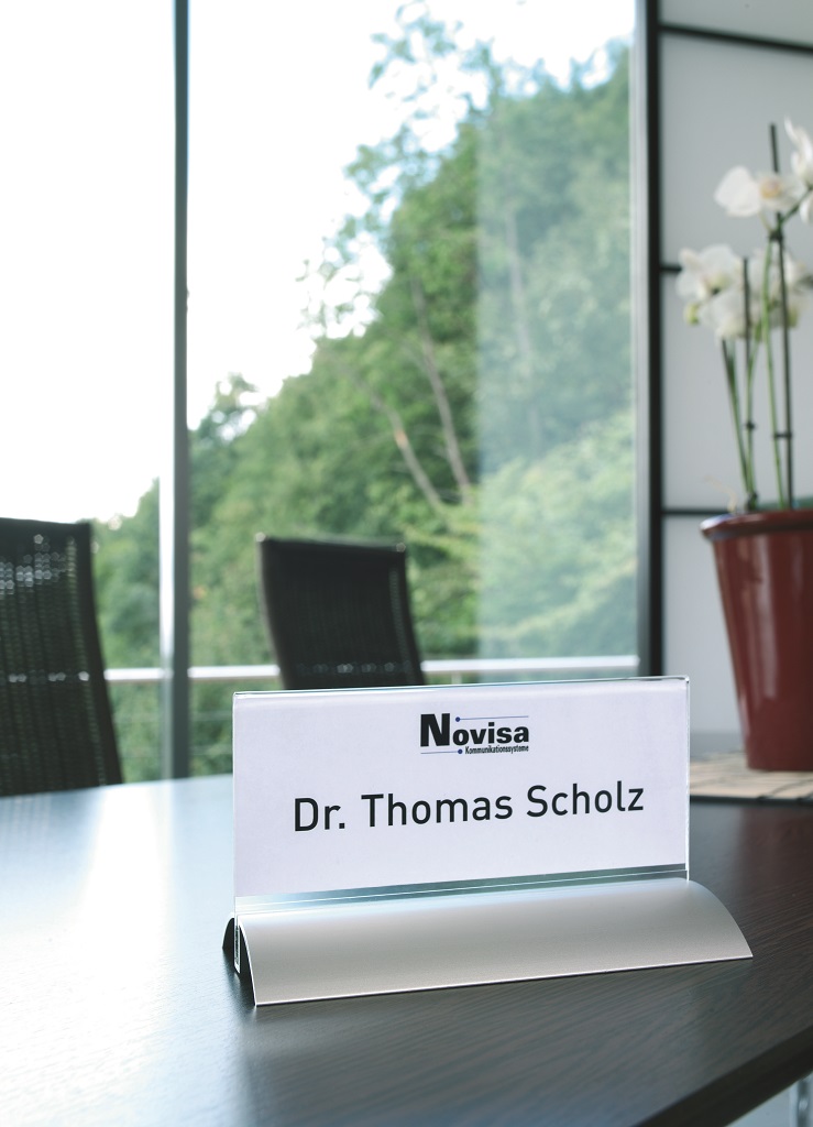 Štýlová stolová menovka s hliníkovým podstavcom. Unikátny uchytávací systém zabraňuje samovoľnému alebo neželanému vysunutiu menovky.Čítanie z oboch strán. Ideálna na konferencie, porady alebo miesta na styk so zákazníkom. Balenie 2 ks.