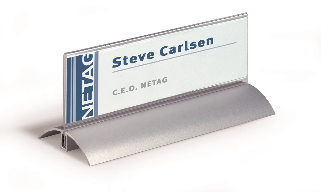 Štýlová stolová menovka s hliníkovým podstavcom. Unikátny uchytávací systém zabraňuje samovoľnému alebo neželanému vysunutiu menovky.Čítanie z oboch strán. Ideálna na konferencie, porady alebo miesta na styk so zákazníkom. Balenie 2 ks.