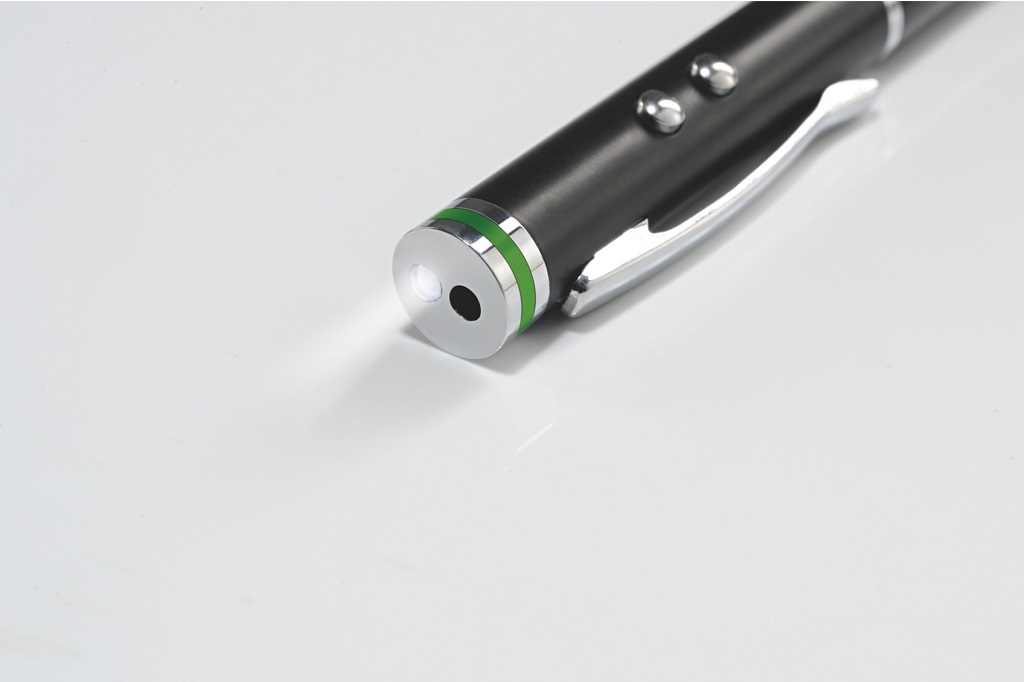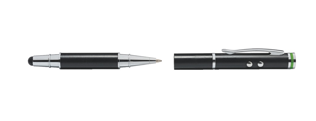 Stylus pre dotykové obrazovky so 4 funkciami slúži aj ako guľôčkové pero, laserové ukazovadlo a vreckové LED svietidlo. Mäkký silikónový hrot chrániaci pred poškriabaním, vysokokvalitné pero s vymieňateľnou náplňou. Súčasťou balenia sú 3 batérie typu LR41. Farba čierna.