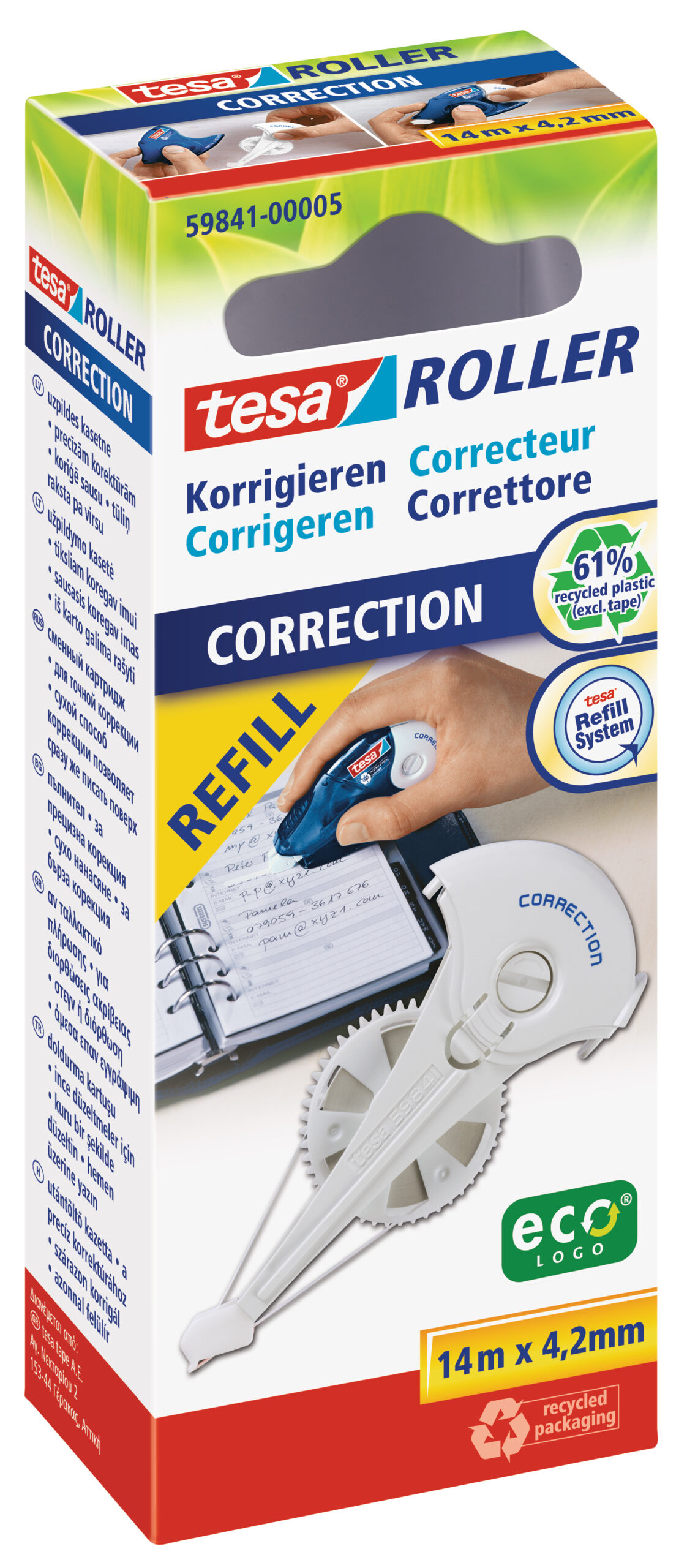 Náhradná náplň do praktického rollera v ergonomickom tvare s jednoduchým použitím na presné opravy s výstužou z PET proti pretrhnutiu. Farba dokonale kryje a okamžite priľne k podkladu. Po nanesení sa dá okamžite popisovať. Telo rollera vyrobené zo 100% recyklovaných plastov, náplň zo 61 % recyklovaných plastov. Neobsahuje rozpúšťadlá. Väčšie balenie 5 ks. Šírka stopy 4,2 mm. Návin 14 m.