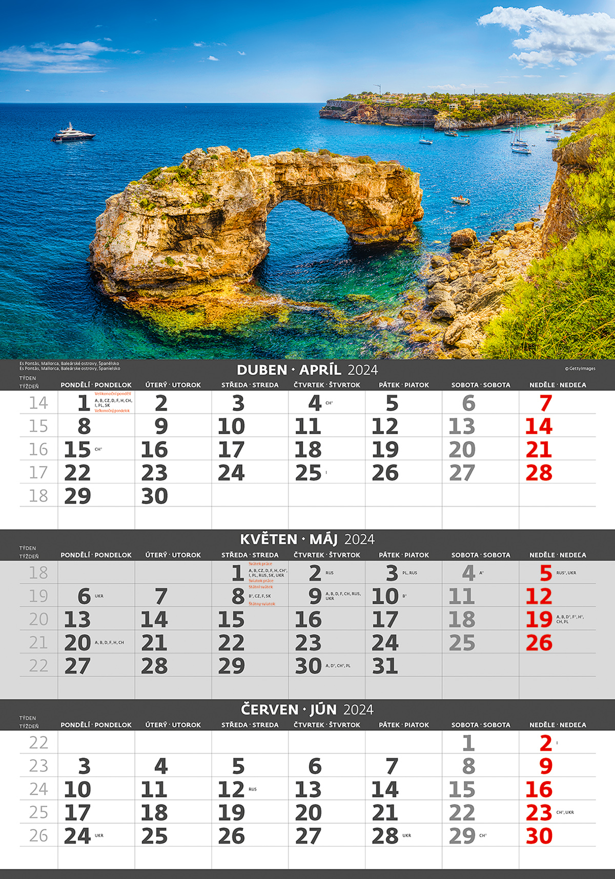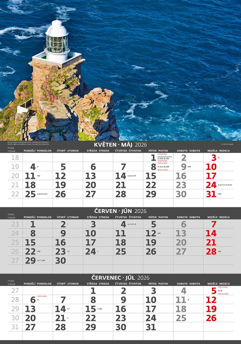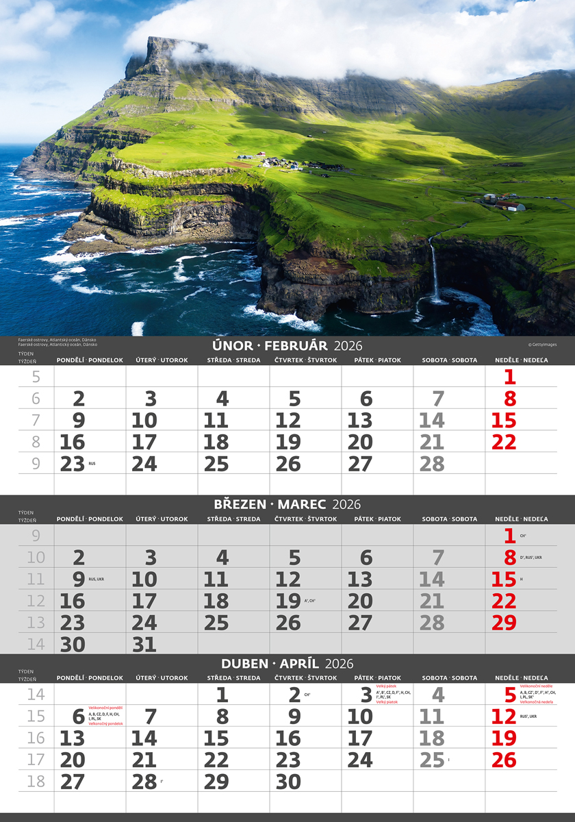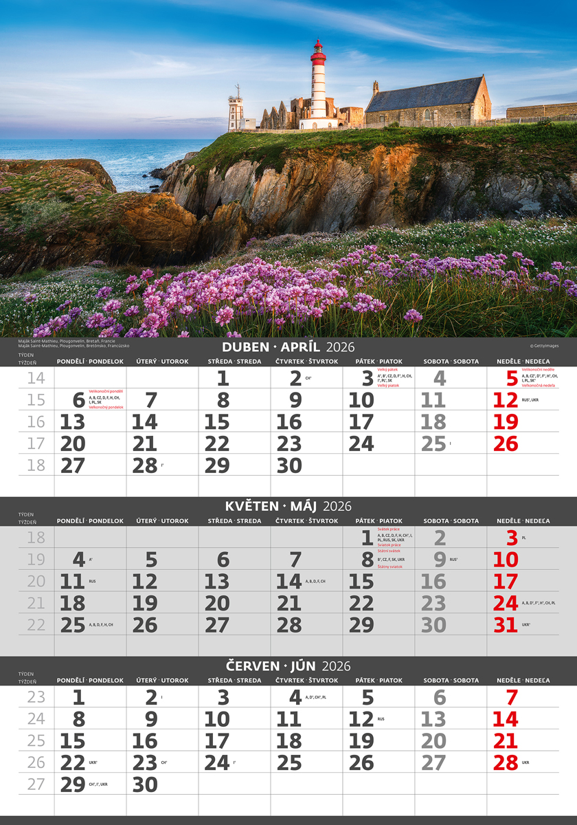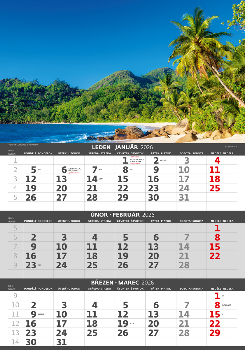 Kalendárium: české/slovenské trojmesačné so sviatkami európskych štátov (CZ / SK / A / B / D / F / H / CH / I / PL / RUS / UKR)