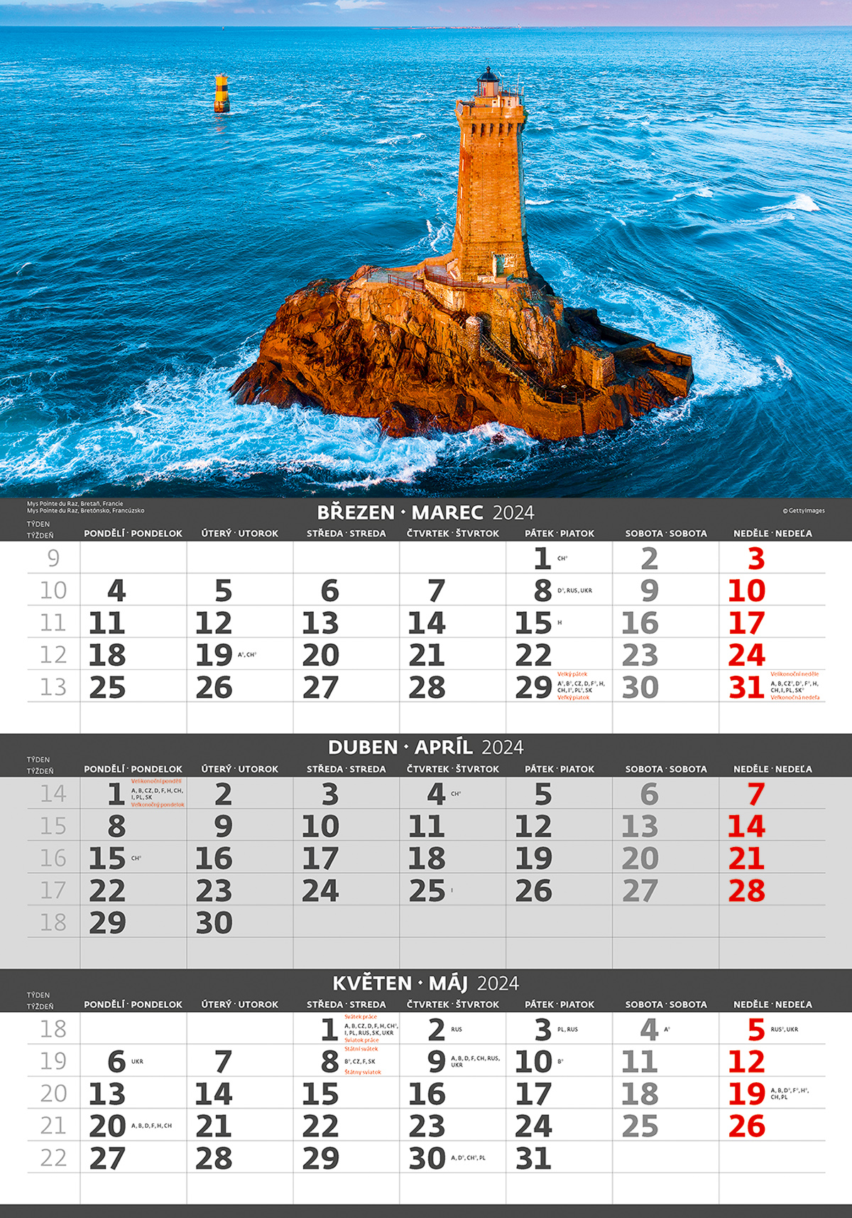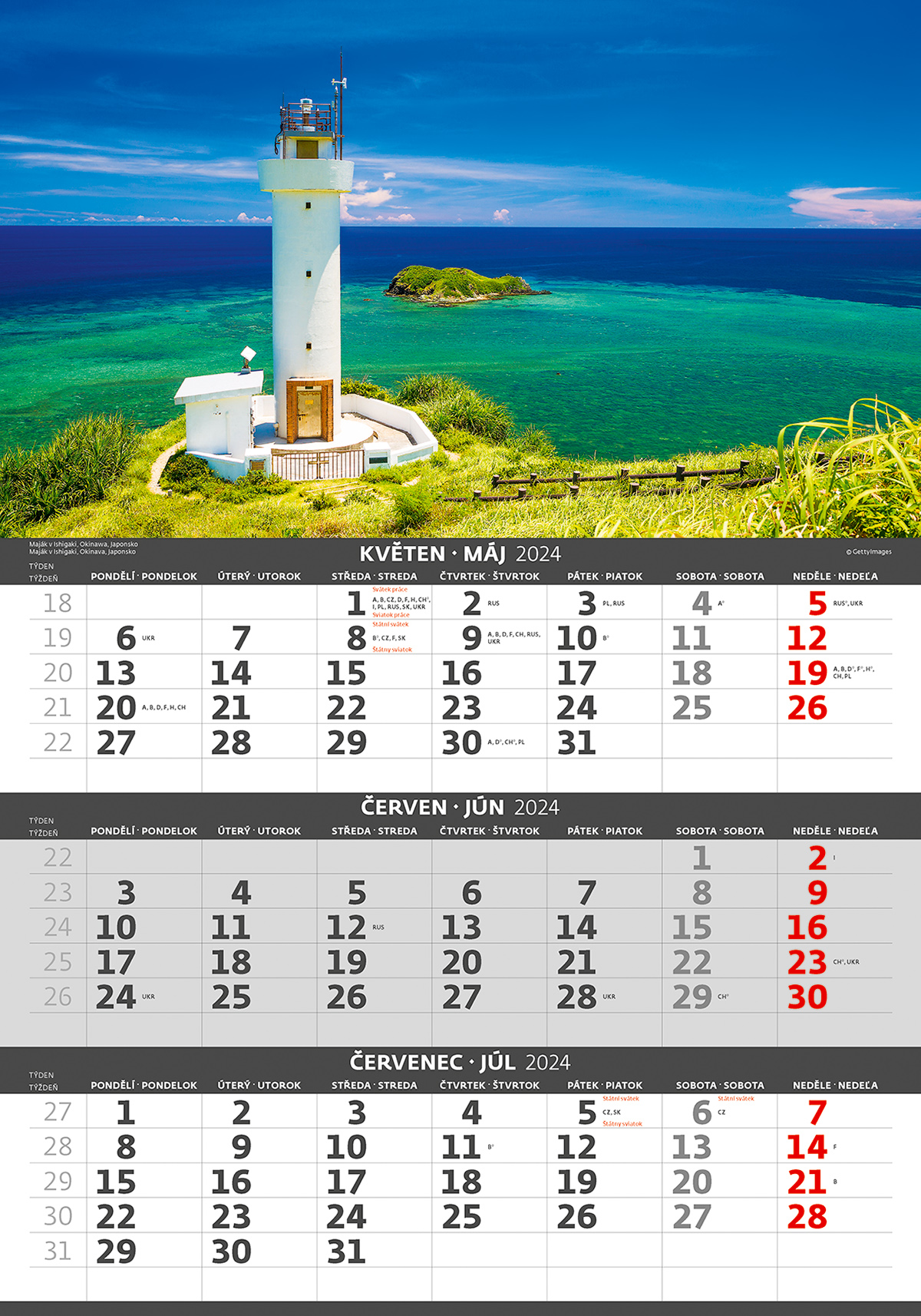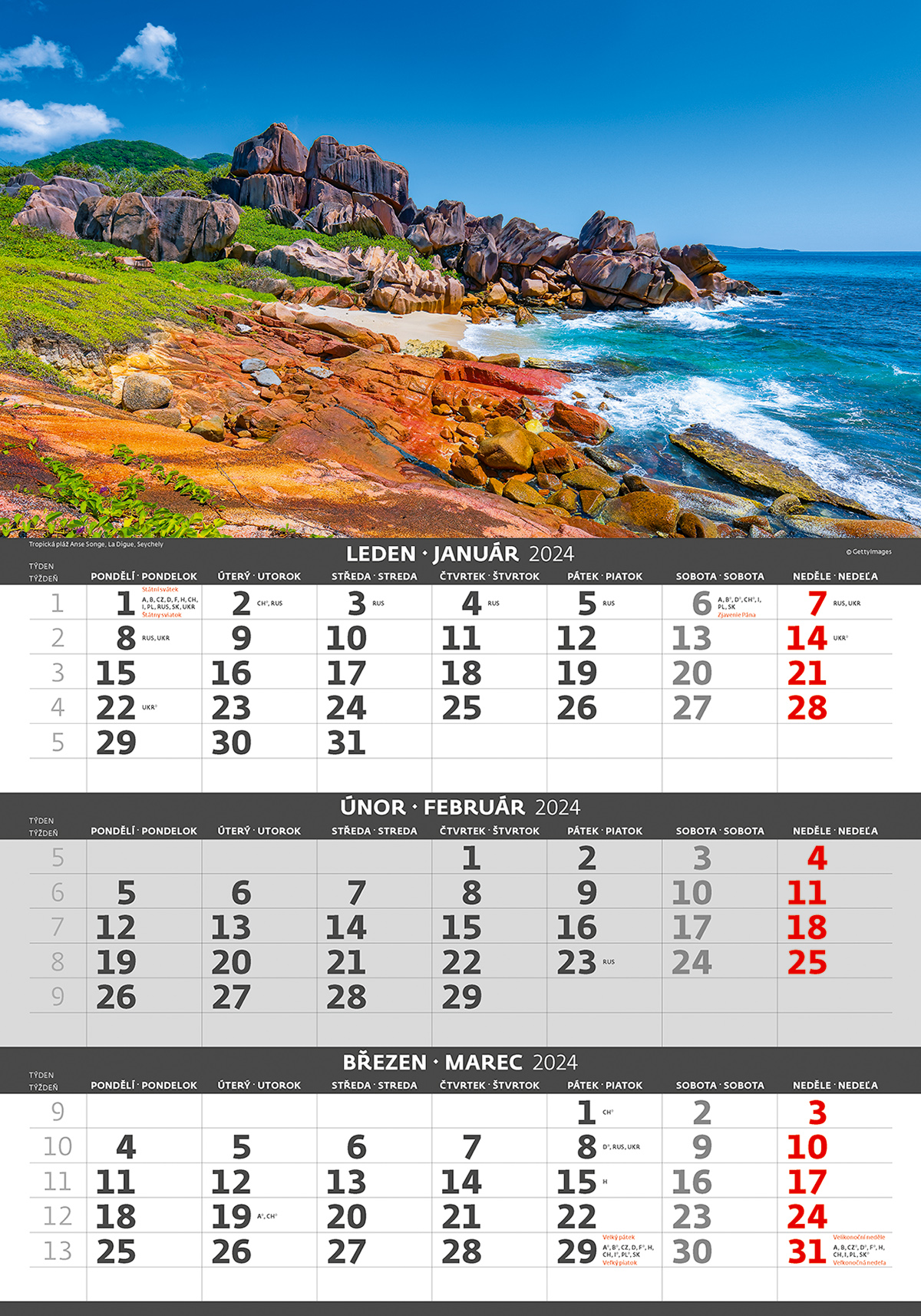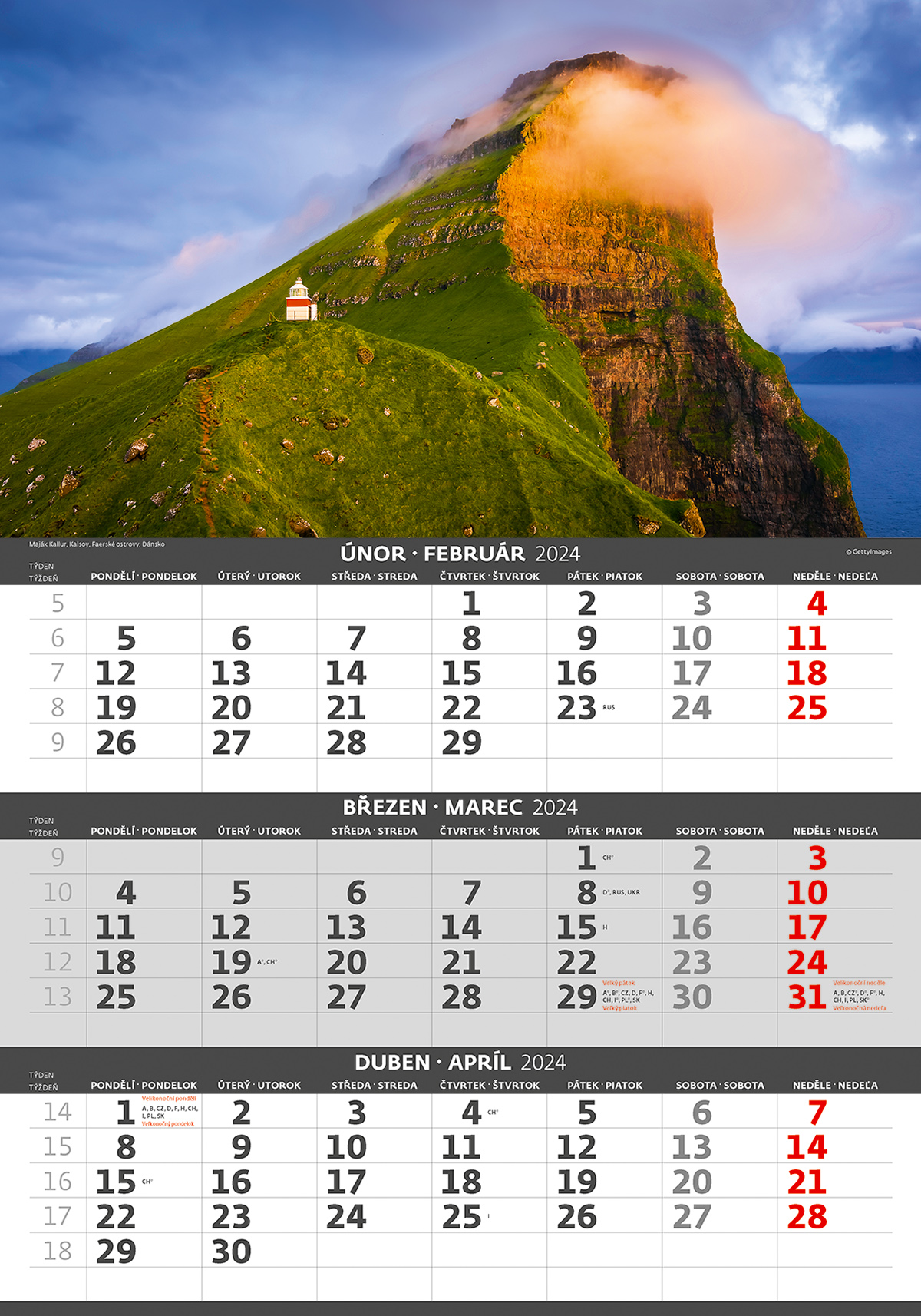 Kalendárium: české/slovenské trojmesačné so sviatkami európskych štátov (CZ / SK / A / B / D / F / H / CH / I / PL / RUS / UKR)
