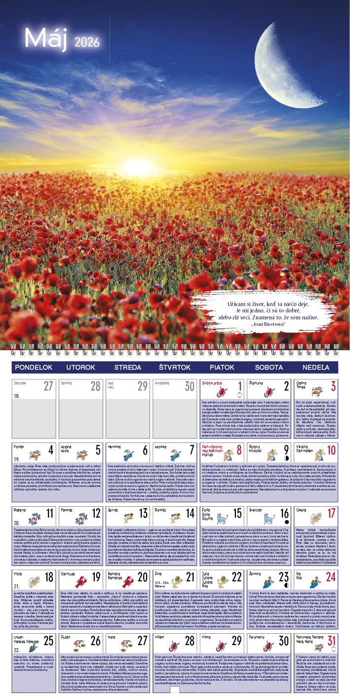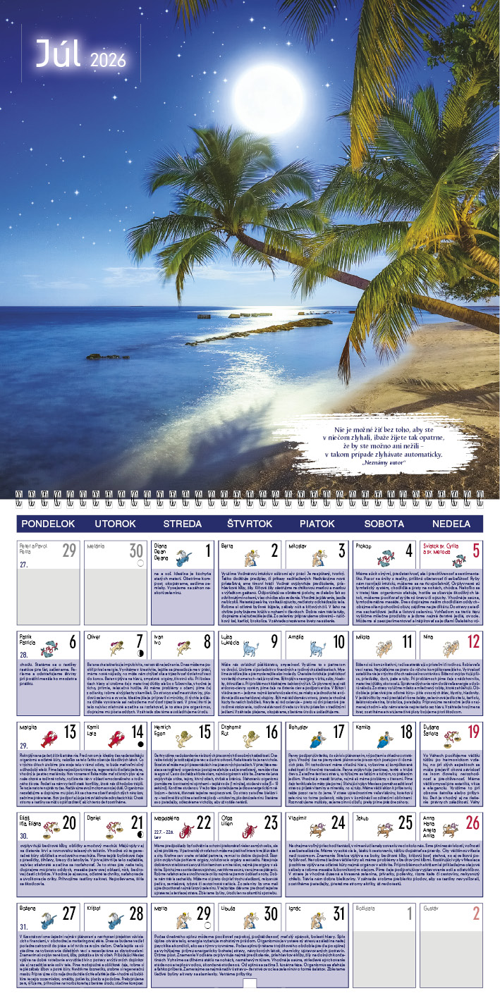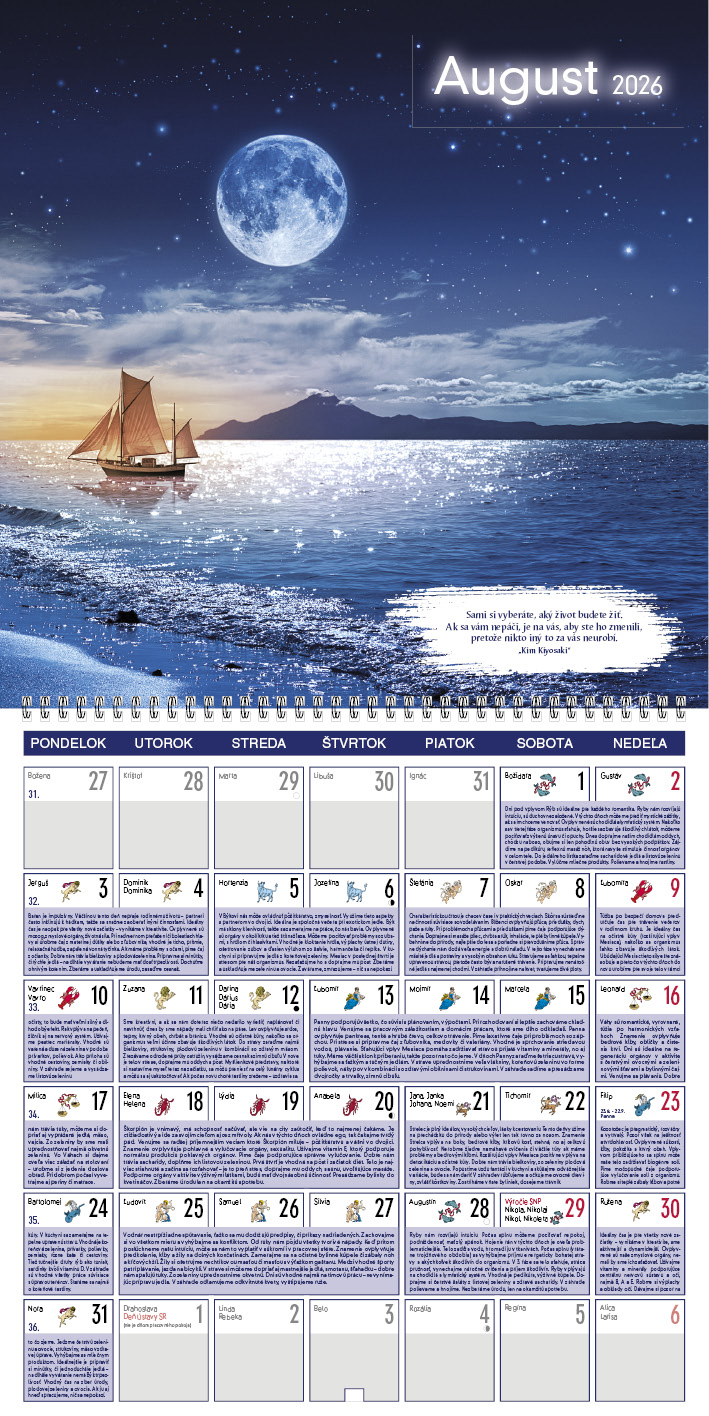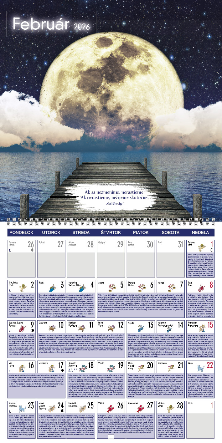 Tento kalendár ponúka praktické rady pre každý deň, ktoré sa riadia podľa fáz Mesiaca. Dozviete sa, kedy je vhodný čas na odpočinok, aktivitu, rozhodovanie či starostlivosť o telo a dušu. Každá fáza prináša odporúčania, čo robiť a čomu sa radšej vyhnúť. Silné fotografie a inšpiratívne citáty dodávajú kalendáru výnimočnú atmosféru.