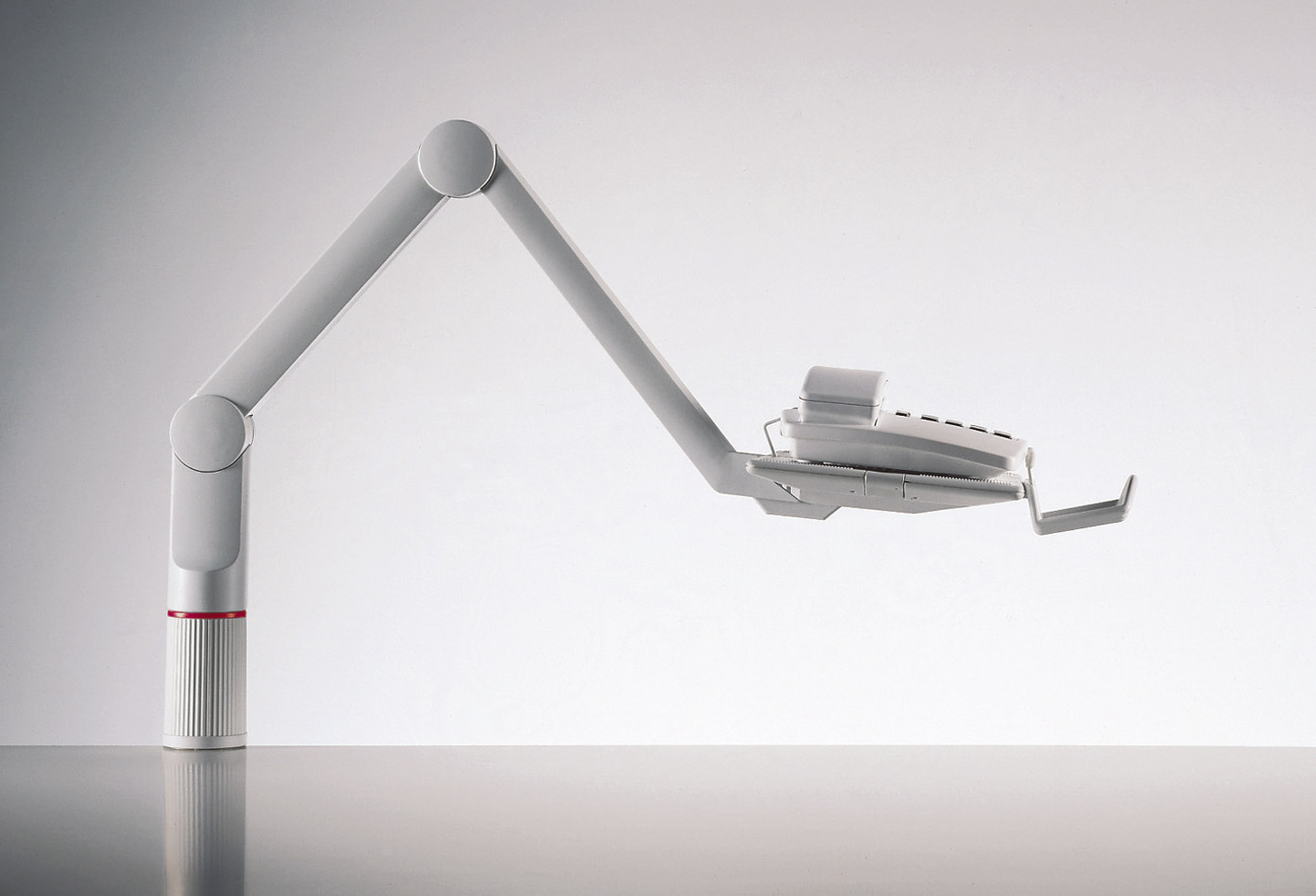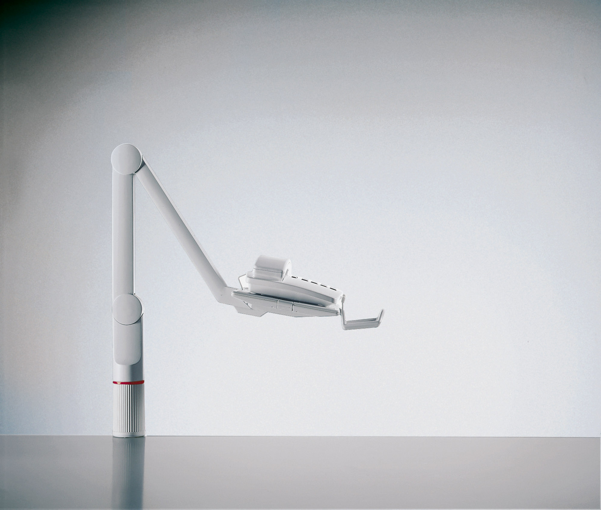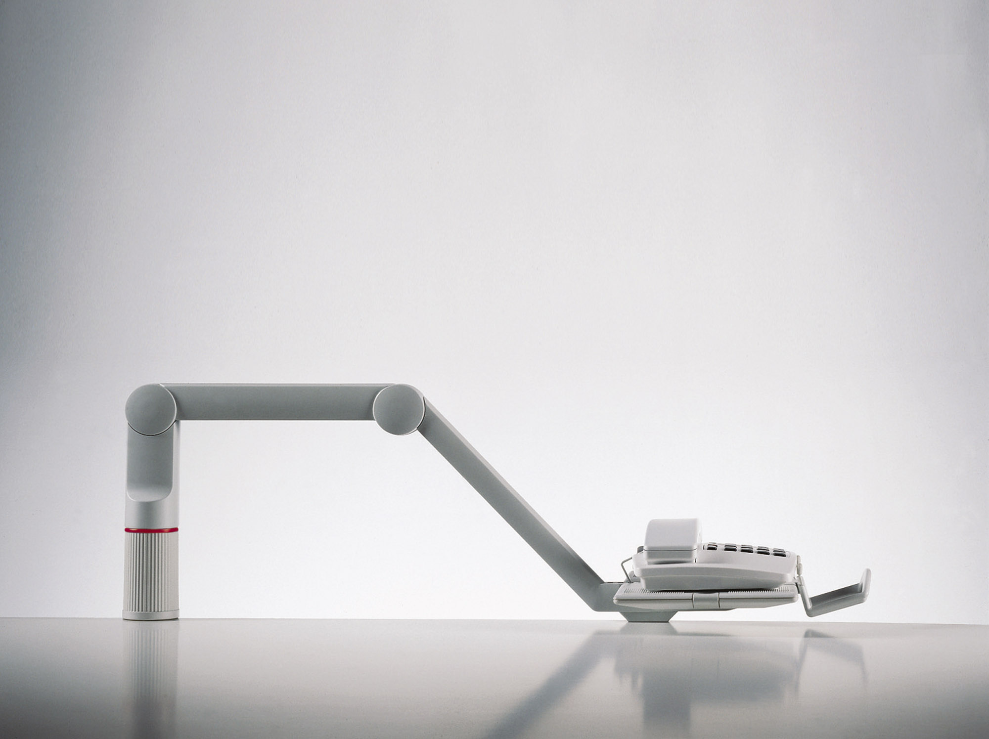 Kĺbový nosič telefónu. Otáčanie o 360 stupňov, 3 fixované pozície, nosnosť 2 kg. Sklon základne (10, 5 a 0 stupňov) upravuje výber pozície a umožňuje pohodlnú manipuláciu s nosičom. Výška nad pracovným stolom 14 cm. Základňa inštalovaná na šírku alebo na výšku, t. j. 26 × 17 cm alebo 17 × 26 cm. Dodávaný v štandarnej verzii s úchytom na hrúbku stola 1,8 až 7,4 cm. Farba sivá.