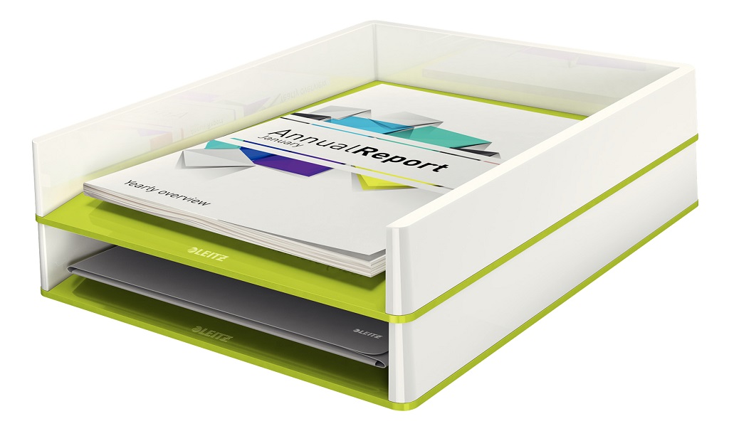 Stohovateľný kancelársky odkladač na dokumenty, časopisy a zložky v dvojfarebnom prevedení v metalických farbách WOW s lesklým povrchom. Farba zelená.