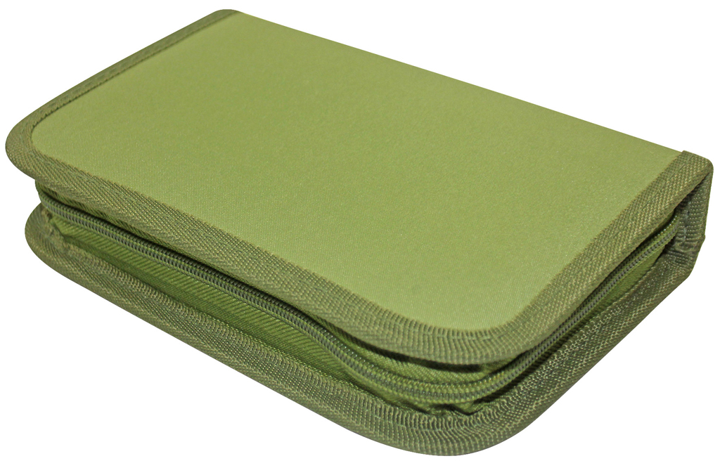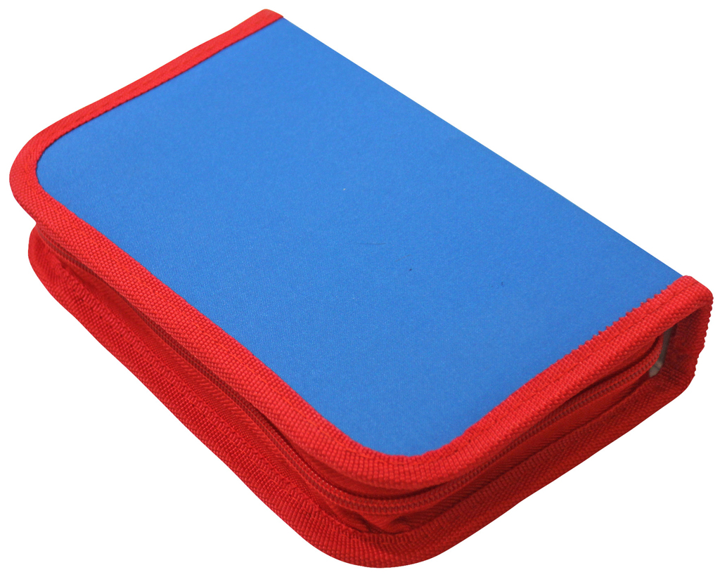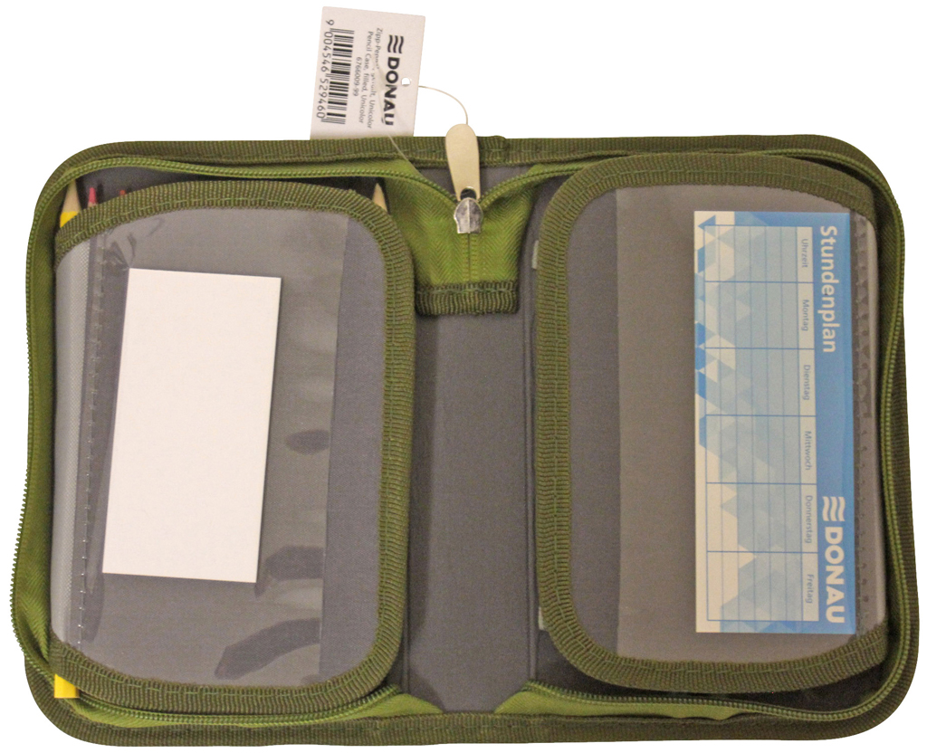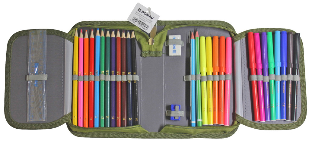 Plný 1-zipsový peračník, 2-chlopňový, 6 rôznych farieb (olivová, modro-červená, tyrkysová, zeleno-modrá, čierno-oranžová, sivo-ružová), 32 kusov (obsah: 1 rozvrh hodín, 1 poznámkový blok bez riadkov, 1 pravítko, 12 farebných ceruziek, 1 guma, 1 strúhadlo, 2 ceruzky, 13 fixiek), materiál polyester, ŠxVxH: 195x36x130mm, hmotnosť 330g.