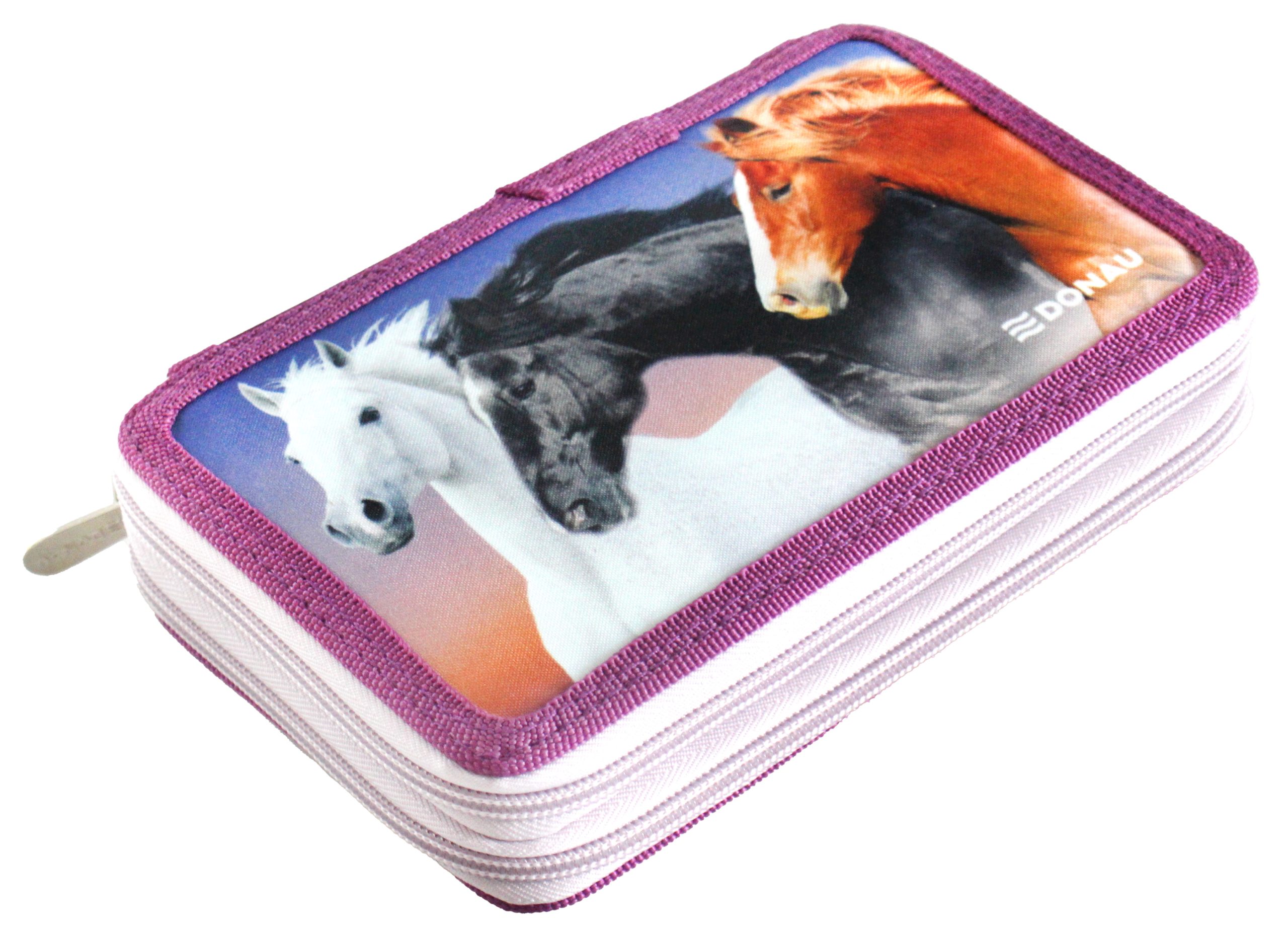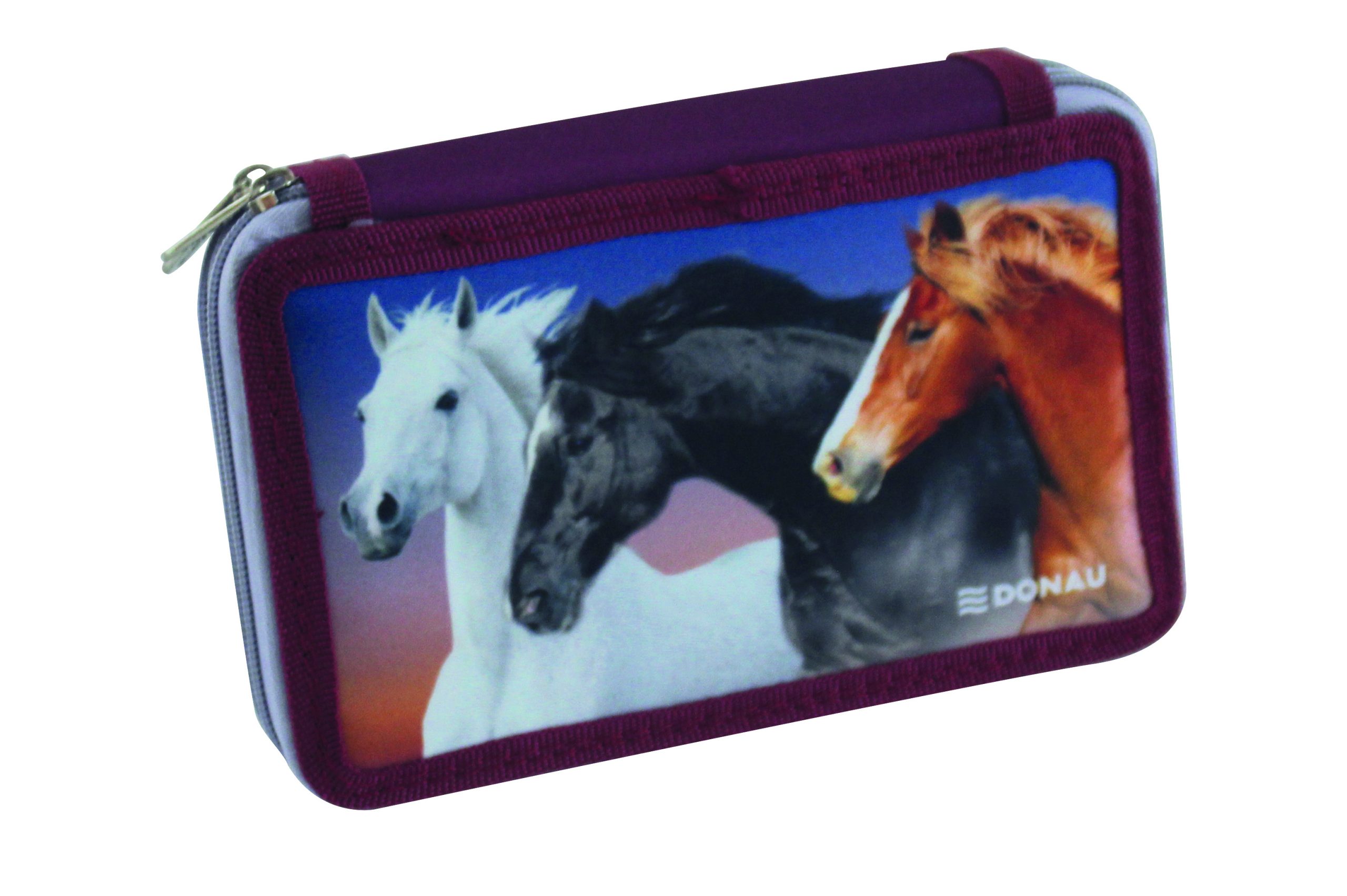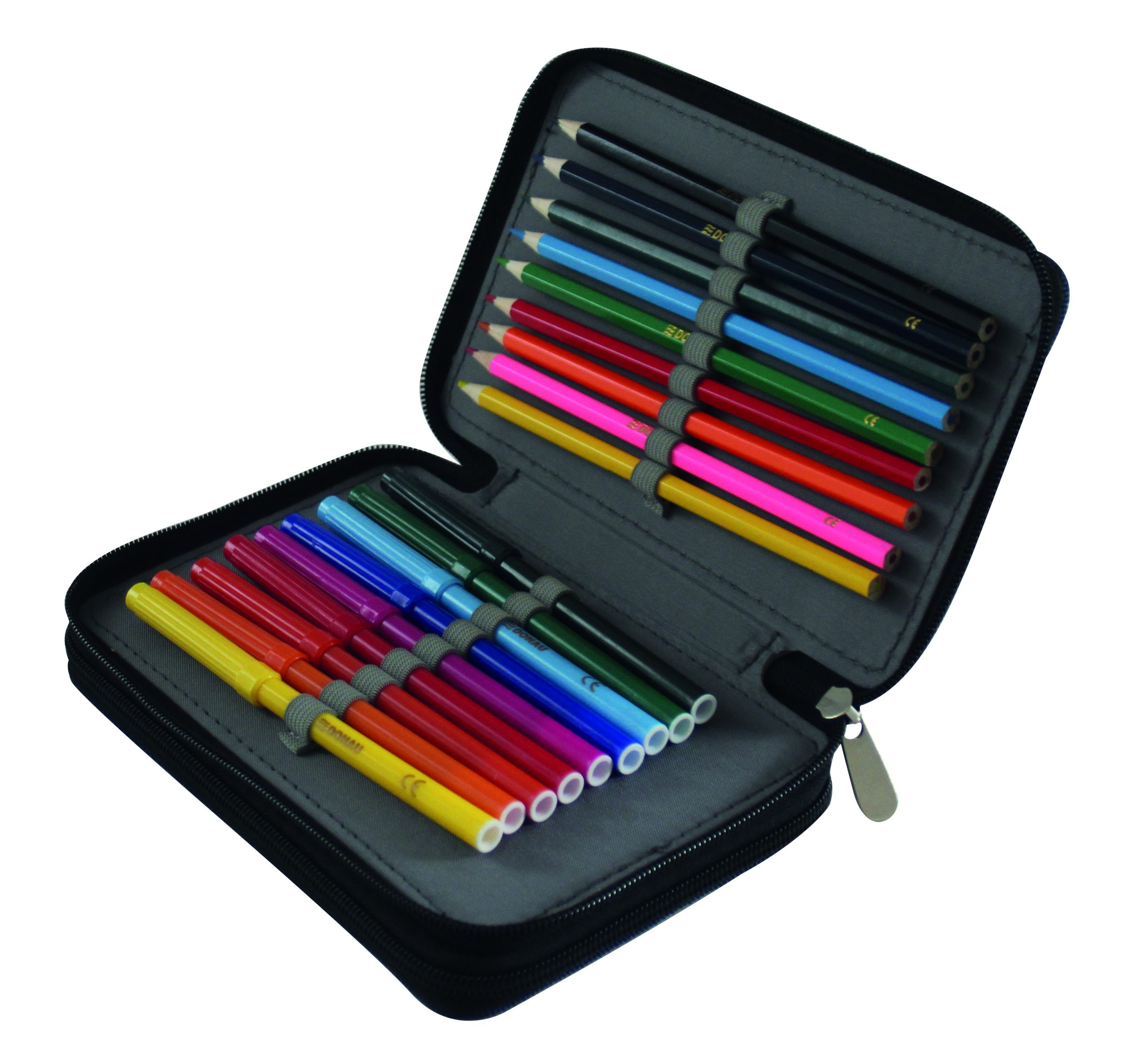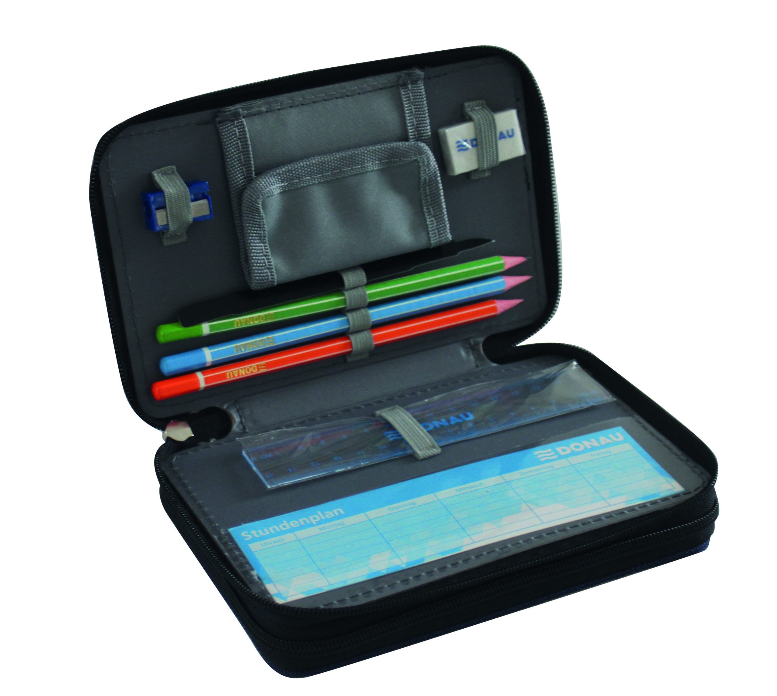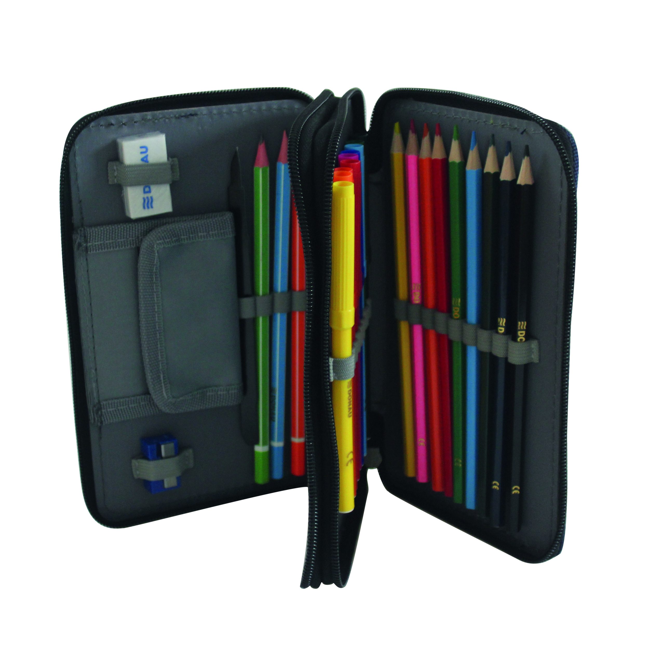 Peračník 2-zipsový s výbavou, v 6 rôznych dizajnoch. S praktickým vnútorným vreckom na drobnosti, vyrobený z odolného polyesterového materiálu. Výbava (23 dielov): 1 guma, 1 strúhadlo, 3 ceruzky, 1 pravítko, 1 rozvrh hodín, 8 fixiek, 8 farebných ceruziek. Rozmery: Š x V x H: 200 x 40 x 130 mm.