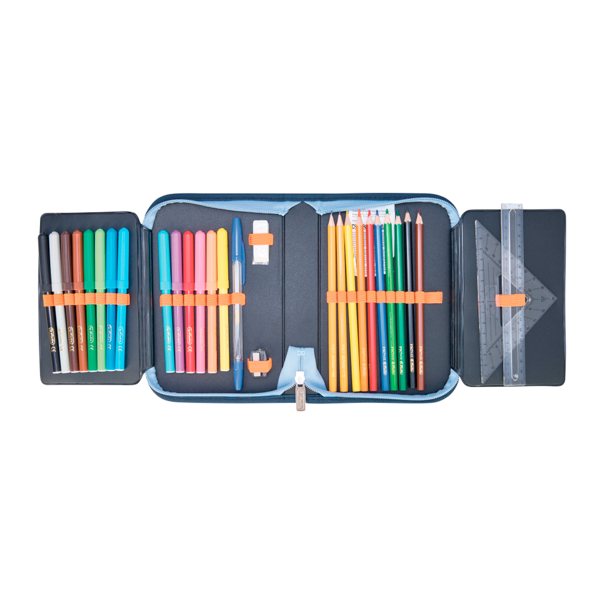Peračník 2-klopý s výbavou, vnútorná podšívka: farebná. Výbava: 14 fixiek, 8 šesťhranných pasteliek, 2 ceruzky šesťhranné, 1 plastové strúhadlo, 1 guma, 1 plastové pravítko 16 cm, 1 trojuholníkové pravítko, 1 guľôčkové pero, 1 rozvrh hodín, 1 vizitka. Dizajn: TechMech.
