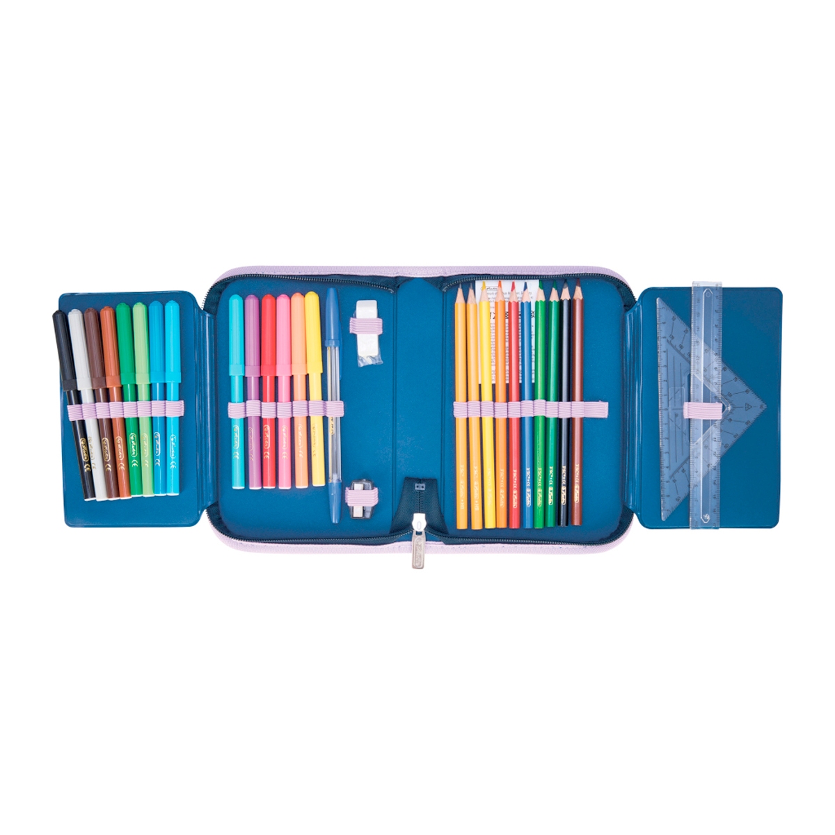 Peračník 2-klopý s výbavou, vnútorná podšívka: farebná. Výbava: 14 fixiek, 8 šesťhranných pasteliek, 2 ceruzky šesťhranné, 1 plastové strúhadlo, 1 guma, 1 plastové pravítko 16 cm, 1 trojuholníkové pravítko, 1 guľôčkové pero, 1 rozvrh hodín, 1 vizitka. Dizajn: Unicorn.