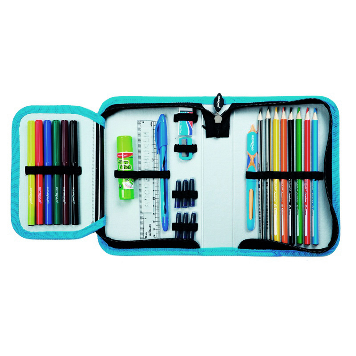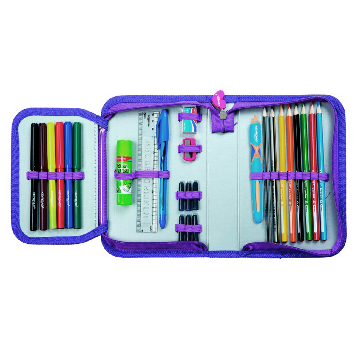 Školský peračník 1-zipsový s výbavou, 29 položiek. V súprave: 6 fixiek, lepidlo, strúhadlo, guma, modré guľôčkové pero, 6 modrých atramentových náplní, 2 HB ceruzky, plniace pero, 6 pasteliek, pravítko 15 cm, 2 plastové šablóny s písmenami (AM, NZ). Materiál PVC, zips, má jednu priehradku a dve priečky. Rozmery: 19 x 13 x 4,2 cm. Farba: mix farieb, mix vzorov.