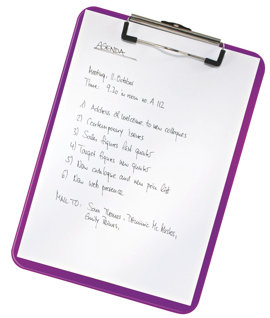 Pevná písacia podložka A4 na každodenné použitie v sviežich farbách WOW s dvojfarebným efektom. Silná kovová spona na uchytenie až 80 listov, háčik na zavesenie. Materiál polystyrol. Väčšie balenie 10 ks. Farba purpurová.
