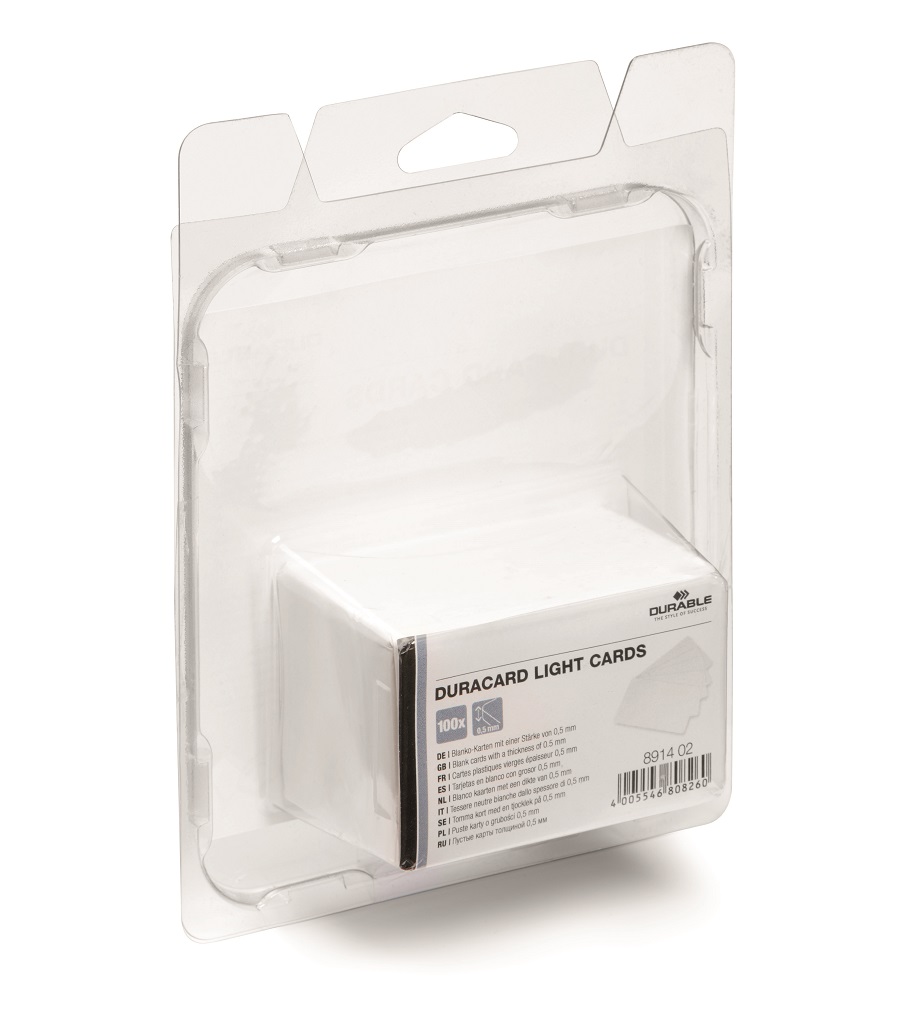 Plastové karty do tlačiarne DURACARD ID 300 Plastové karty tenké v hrúbke 0,5 mm na potlač plastových kariet v tlačiarni DURACARD ID 300. Rozmery 53,98 × 86,60 mm.