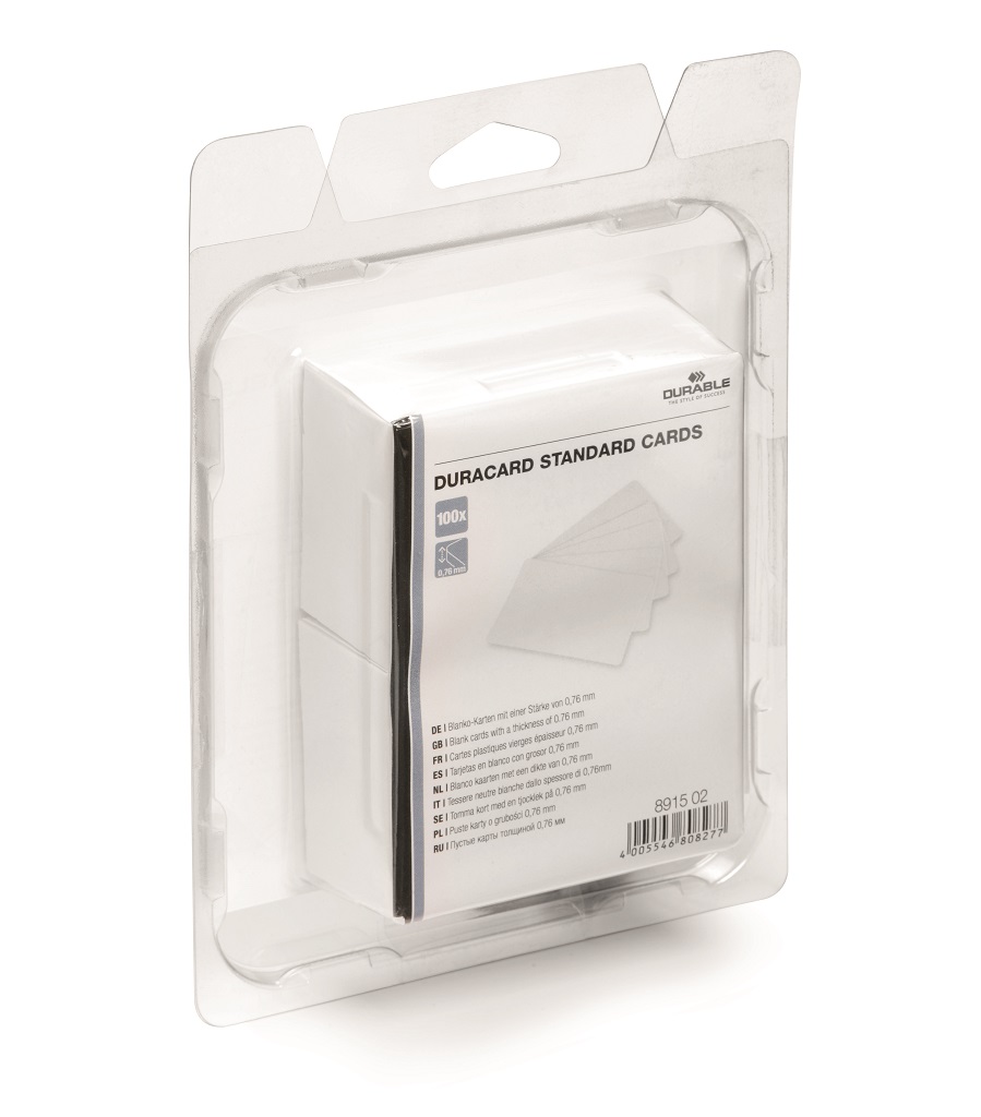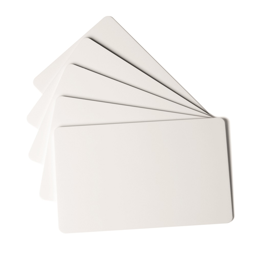 Plastové karty štandardnej hrúbky 0,76 mm na potlač plastových kariet v tlačiarni DURACARD ID 300. Rozmery 53,98 × 86,60 mm.