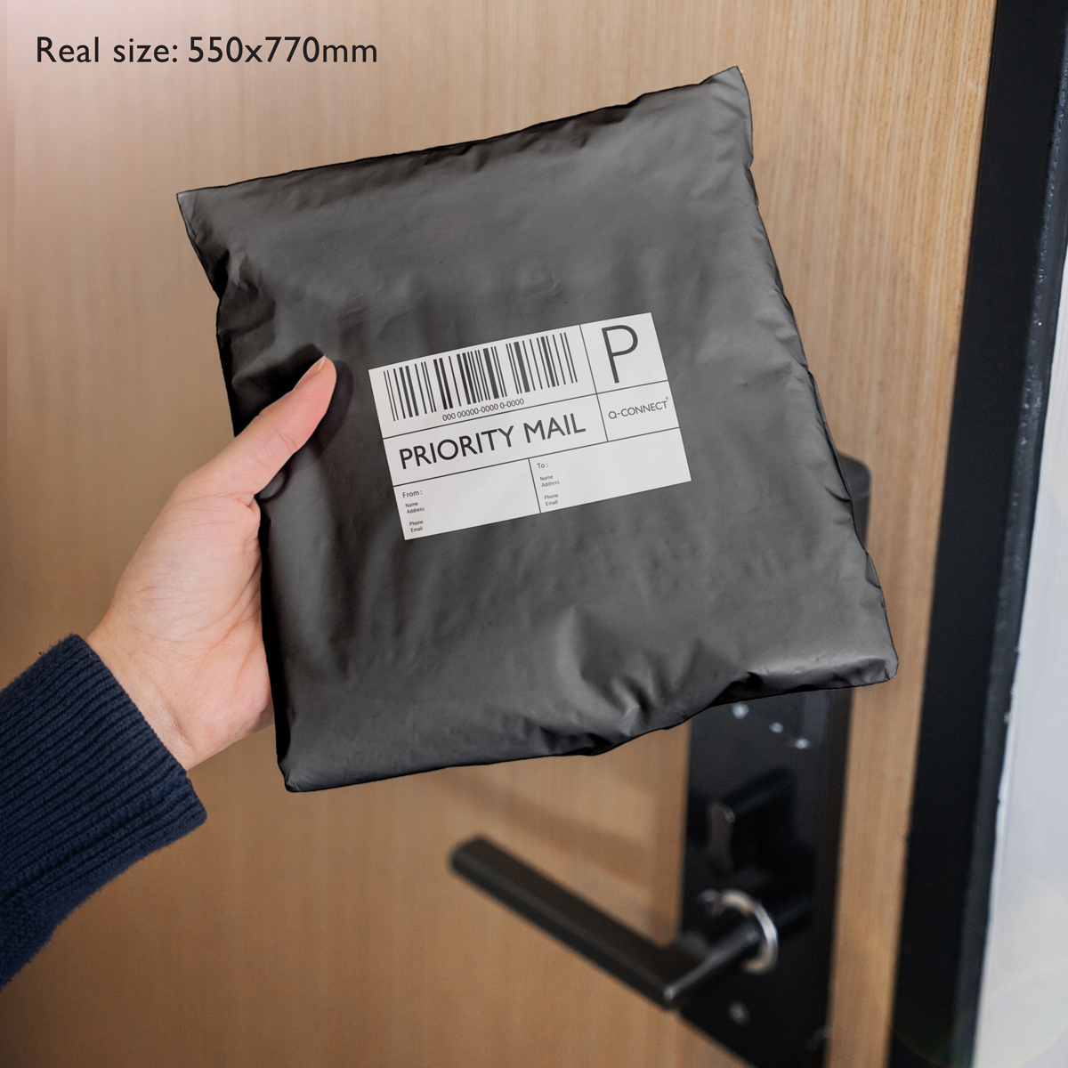 Q-Connect čierne plastové obálky vyrobené zo 100 % recyklovaného materiálu. Trojvrstvová odolná PE fólia 50 mic. Kuriérske tašky sú odolné, vodeodolné, odolné voči roztrhnutiu a prepichnutiu. Majú pevný jednopáskový samotesný uzáver. Rozmery tašky: 550 x 770 mm. Balenie 100 kusov.