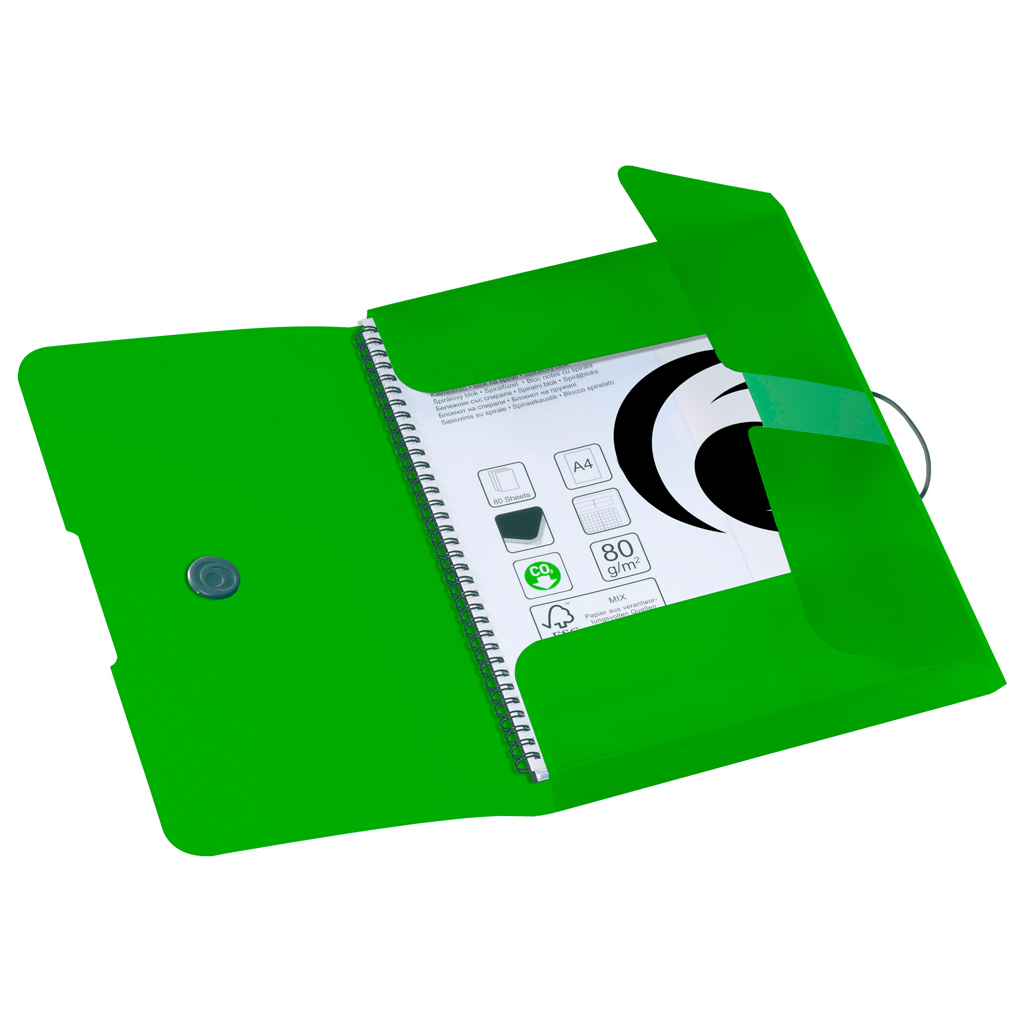 Obal s tromi chlopňami radu Easy Orga z polypropylénu na dokumenty formátu A4. Kapacita 300 listov. Zatváranie sivou gumičkou o sivý plastový krúžok. Väčšie balenie 3 ks. Farba zelená.
