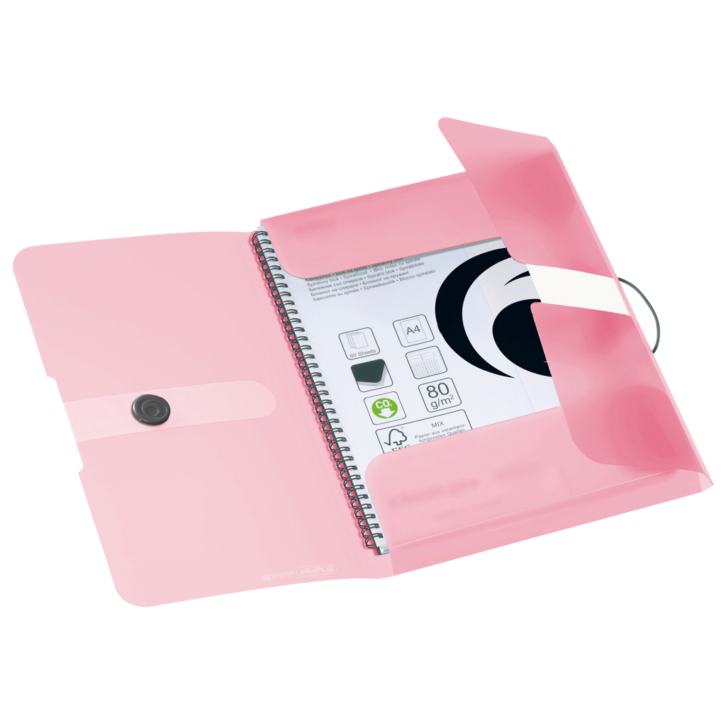 Obal s tromi chlopňami z polypropylénu radu Pastell na dokumenty formátu A4. Kapacita 300 listov. Zatváranie sivou gumičkou o sivý plastový krúžok. Väčšie balenie 3 ks. Farba priehľadná ružová.