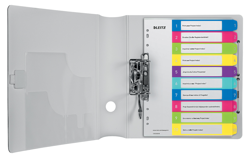 Opakovane použiteľný a extra odolný plastový číselný rozraďovač 1 – 10 v žiarivých farebných kombináciách s univerzálnou perforáciou. Materiál odolný polypropylén hrúbky 0,3 mm. Formát A4 maxi. Možnosť potlače na upravenie podľa vlastných potrieb, predloha stiahnuteľná zdarma na www.esselte.com/ easyprint.