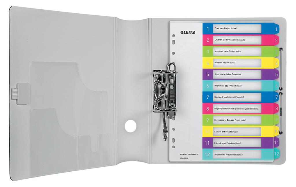 Opakovane použiteľný a extra odolný plastový číselný rozraďovač 1 – 12 v žiarivých farebných kombináciách s univerzálnou perforáciou. Materiál odolný polypropylén hrúbky 0,3 mm. Formát A4 maxi. Možnosť potlače na upravenie podľa vlastných potrieb, predloha stiahnuteľná zdarma na www.esselte.com/ easyprint.