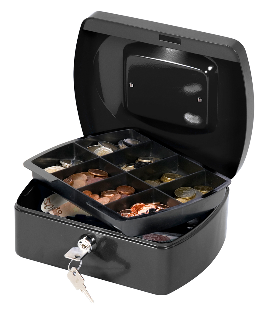 Uzamykateľná pokladnička s tvarovaným úchytom, plastovou priehradkou na mince a 2 kľúčami. Materiál pevná oceľ. Rozmery 205 × 85 × 160 mm. Farba čierna.