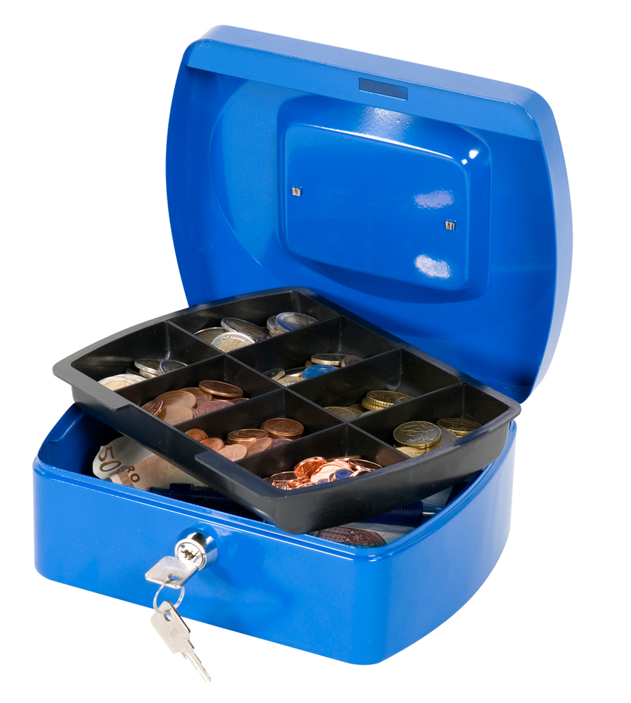 Uzamykateľná pokladnička s tvarovaným úchytom, plastovou priehradkou na mince a 2 kľúčami. Materiál pevná oceľ. Rozmery 205 × 85 × 160 mm. Farba modrá.