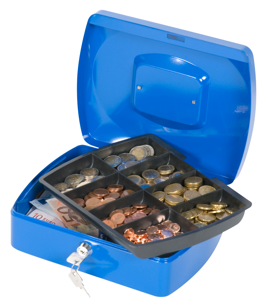 Uzamykateľná pokladnička s tvarovaným úchytom, plastovou priehradkou na mince a 2 kľúčami. Materiál pevná oceľ. Rozmery