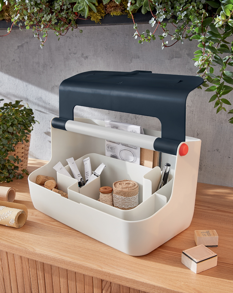 Ľahký a ľahko prenosný úložný box vďaka robustnej rukoväti vystuženej hliníkom. Veko poskytuje uprataný vzhľad a väčšie súkromie, ale dá sa doširoka otvoriť pre ľahký prístup k obsahu. Inteligentné delenie priehradky pre lepšiu organizáciu a rýchly prístup k pomôckam, široká zadná priehradka na uloženie dokumentov veľkosti A4. So zdvihnutím