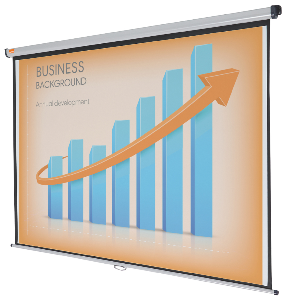 Žiarivý matne biely povrch plátna zaručuje ostrý, podrobný obraz, ktorý zreteľne uvidia všetci diváci. Dá sa ľahko zasunúť do puzdra, aby bolo chránené pred poškodením, alebo uložené, keď nie je používané. Doplnkové držiaky umožňujú inštalovať plátno pred popisovaciu tabuľu alebo ho skloniť smerom k divákom. 1750 × 1090 mm.