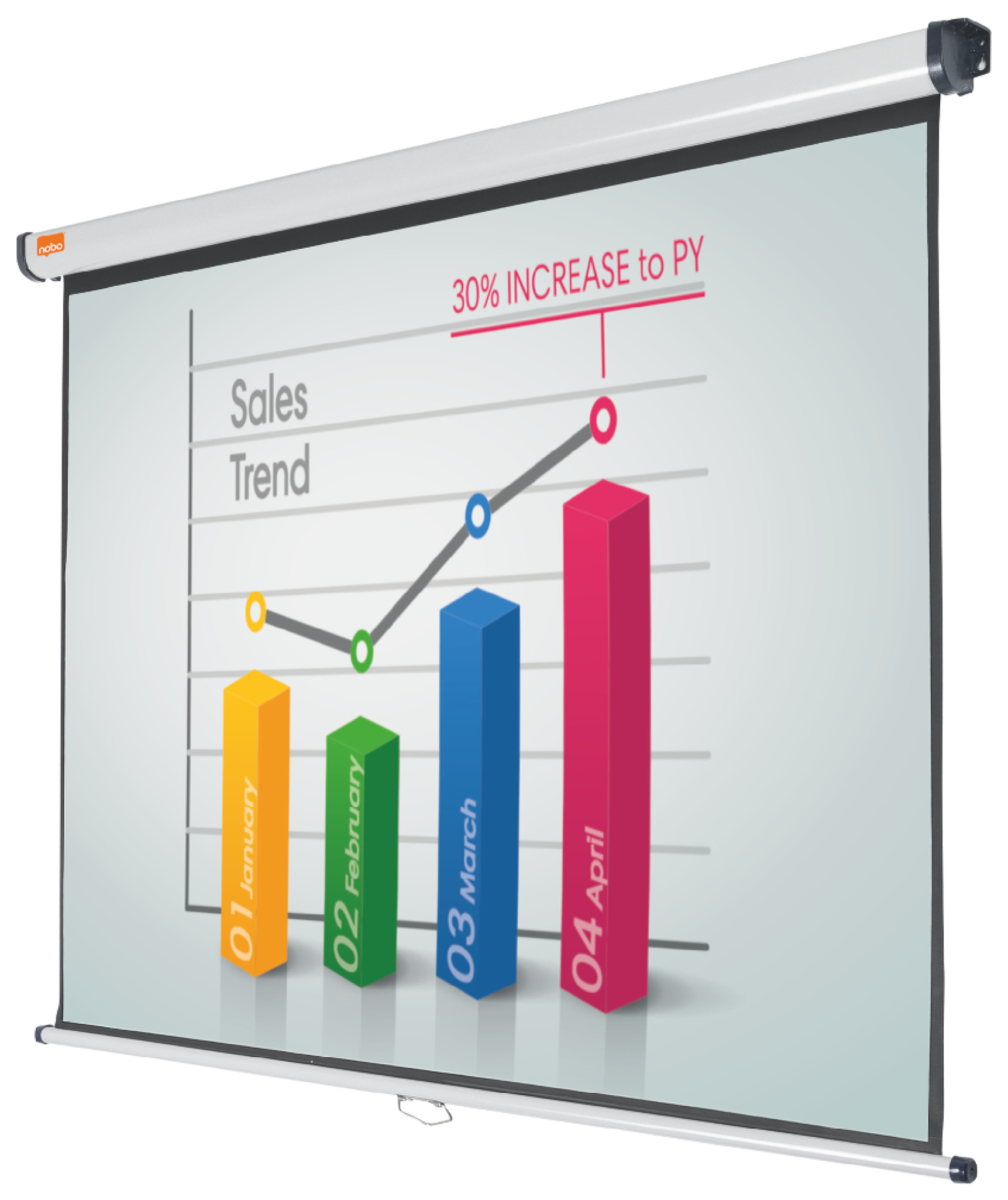 Žiarivý matne biely povrch plátna zaručuje ostrý, podrobný obraz, ktorý zreteľne uvidia všetci diváci. Dá sa ľahko zasunúť do puzdra, aby bolo chránené pred poškodením, alebo uložené, keď nie je používané. Doplnkové držiaky umožňujú inštalovať plátno pred popisovaciu tabuľu alebo ho skloniť smerom k divákom. 1500 × 1138 mm.