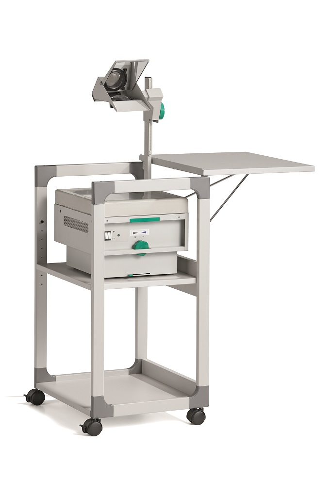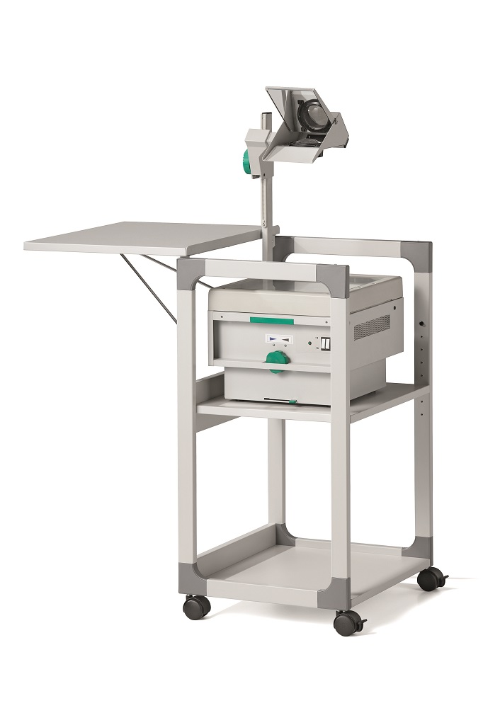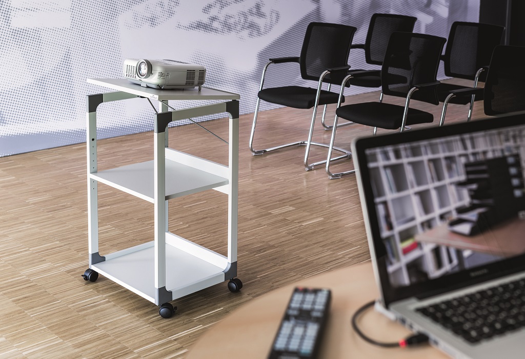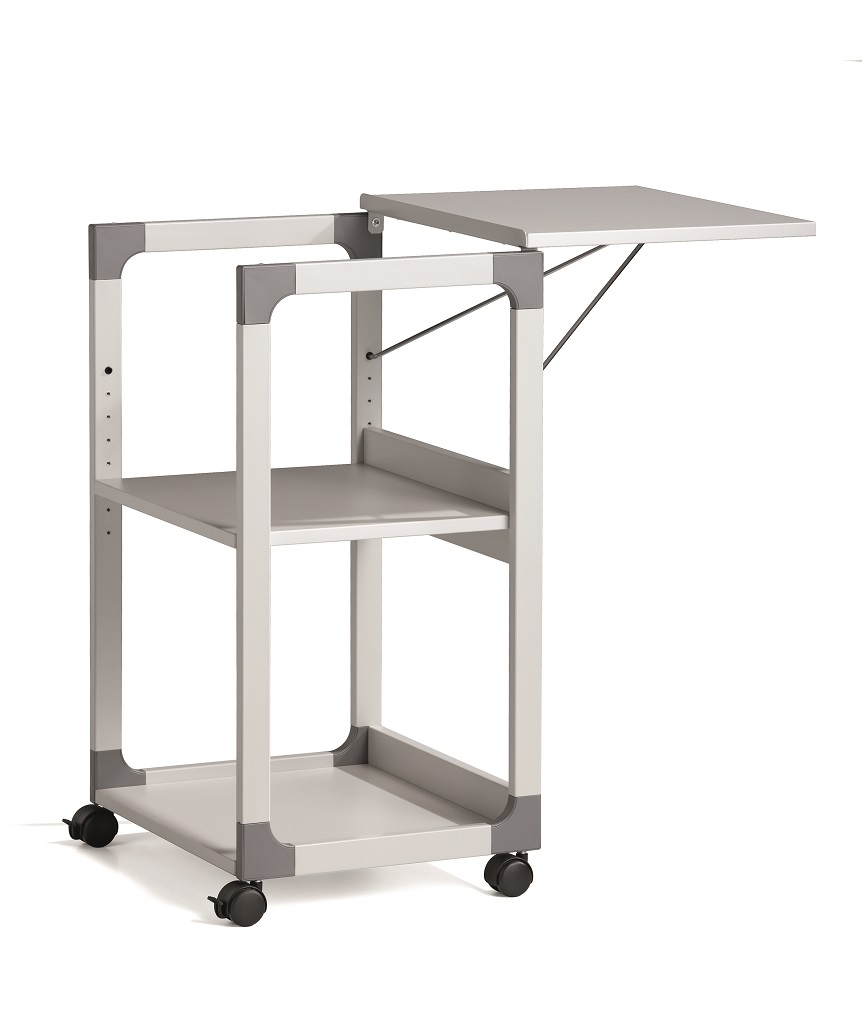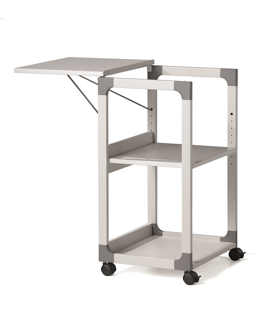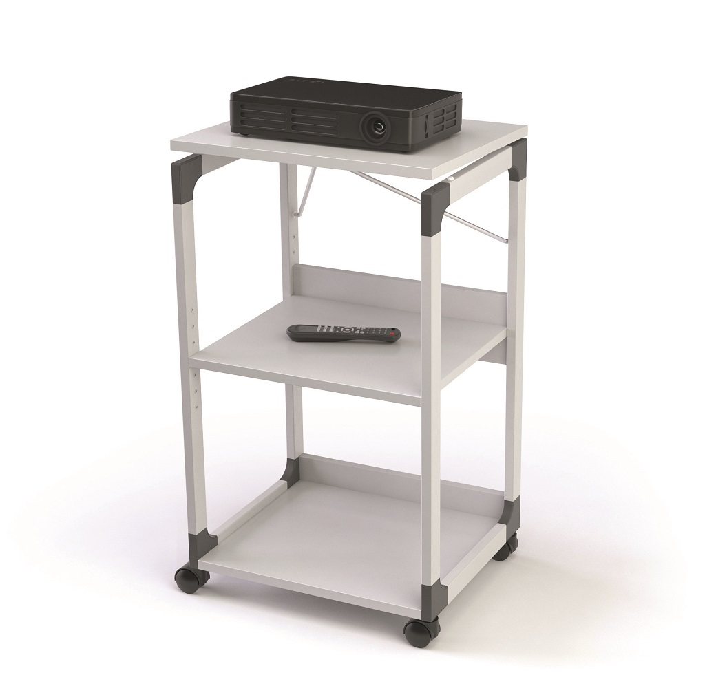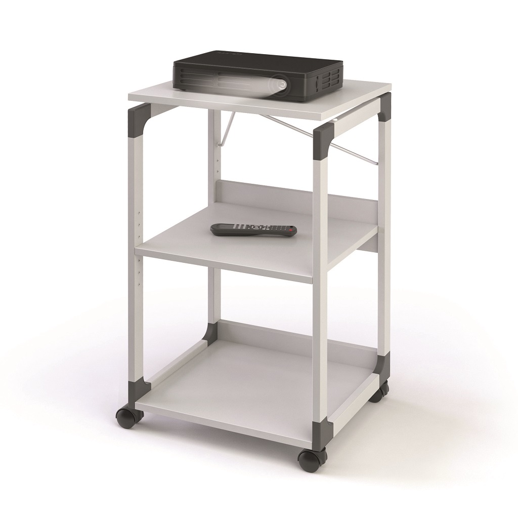 Mobilný projekčný vozík s tromi policami. Horná polica je odnímateľná a pri projekcii sa dá naklopiť do 180°, stredná polica je výškovo nastaviteľná po 32 mm, spodná polica je fixná. Hrúbka políc 19 mm. Materiál pevný kovový lakovaný rám s rohovými spojkami z plastu. Farba sivá. Rozmery š × v × h 508 x 882 x 432 mm.