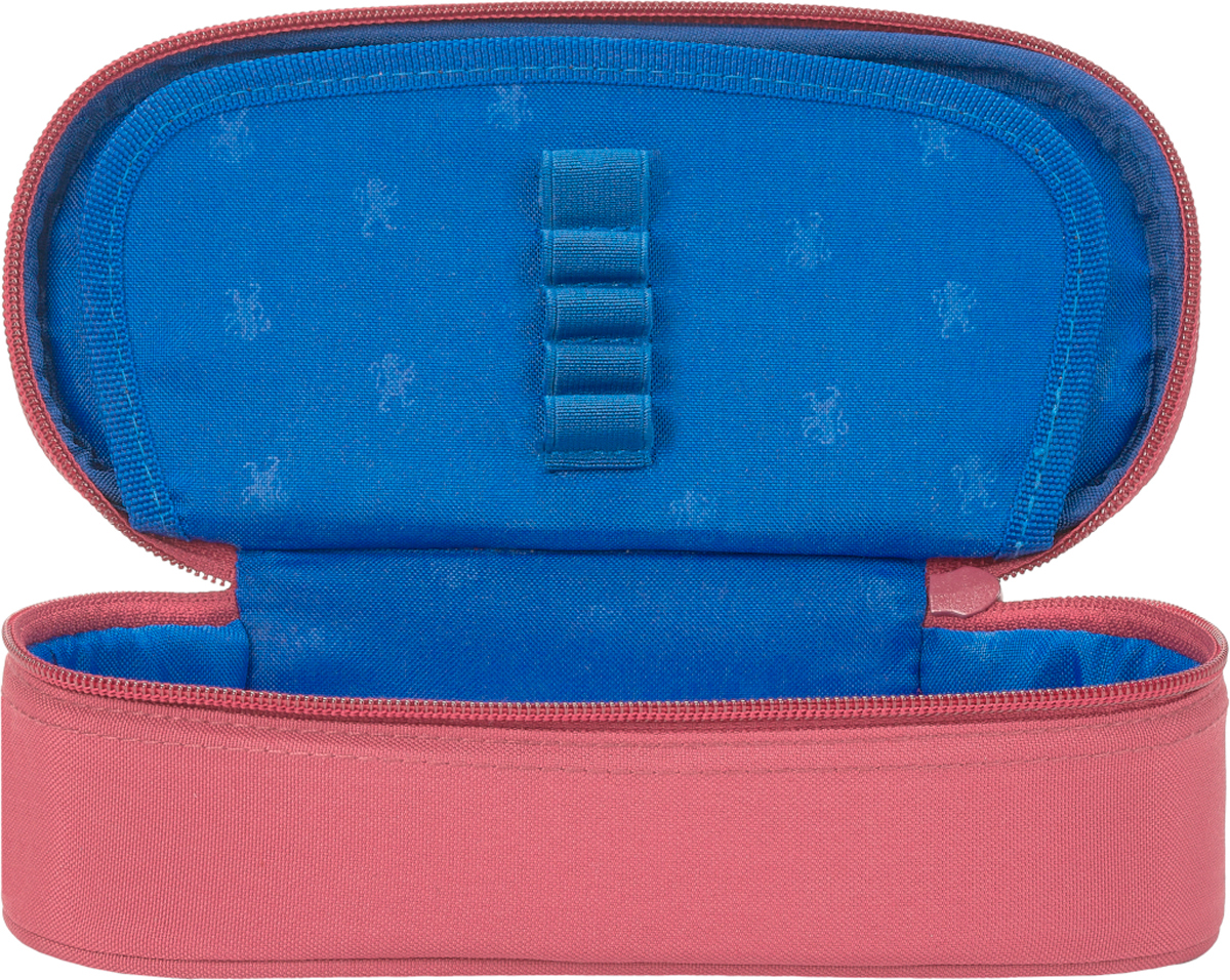 Vodeodolná polyesterová tkanina, tmavo modrá podšívka s vyrazeným vzorom leva. Klopa s integrovaným vreckom a pútkami na pero. Hlavné vrecko na zips. Rozmery 23,5 x 8,5 x 5 cm.
