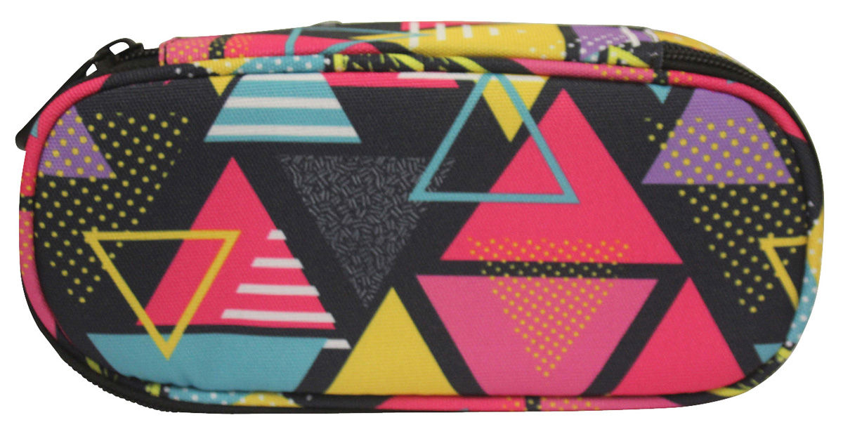 Oválny peračník na zips, 1 vnútorná chlopňa s pútkami na pero, bez náplne, materiál polyester. Rozmery: Š x V x H: 21 x 5,5 x 10,5 cm. Motív Trojuholník.