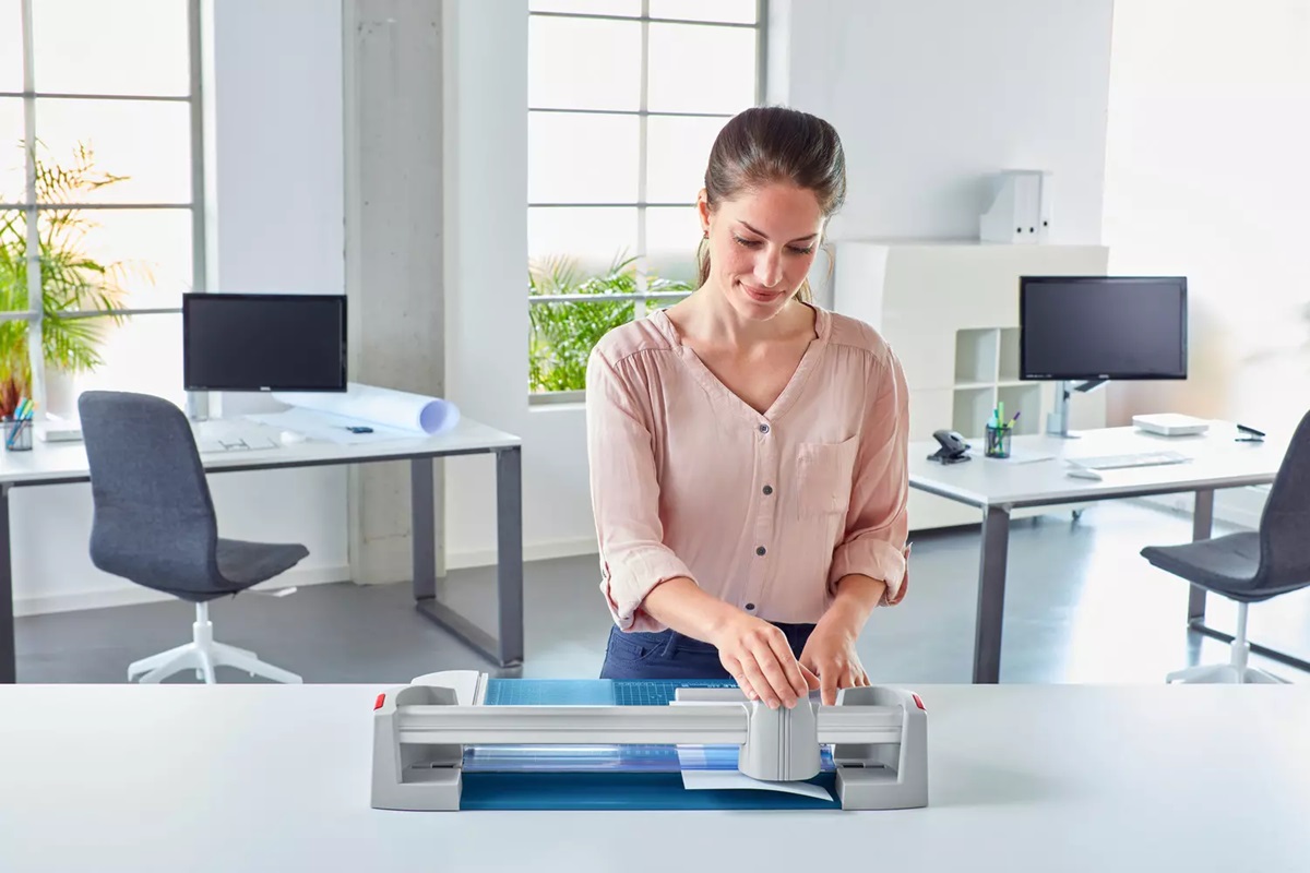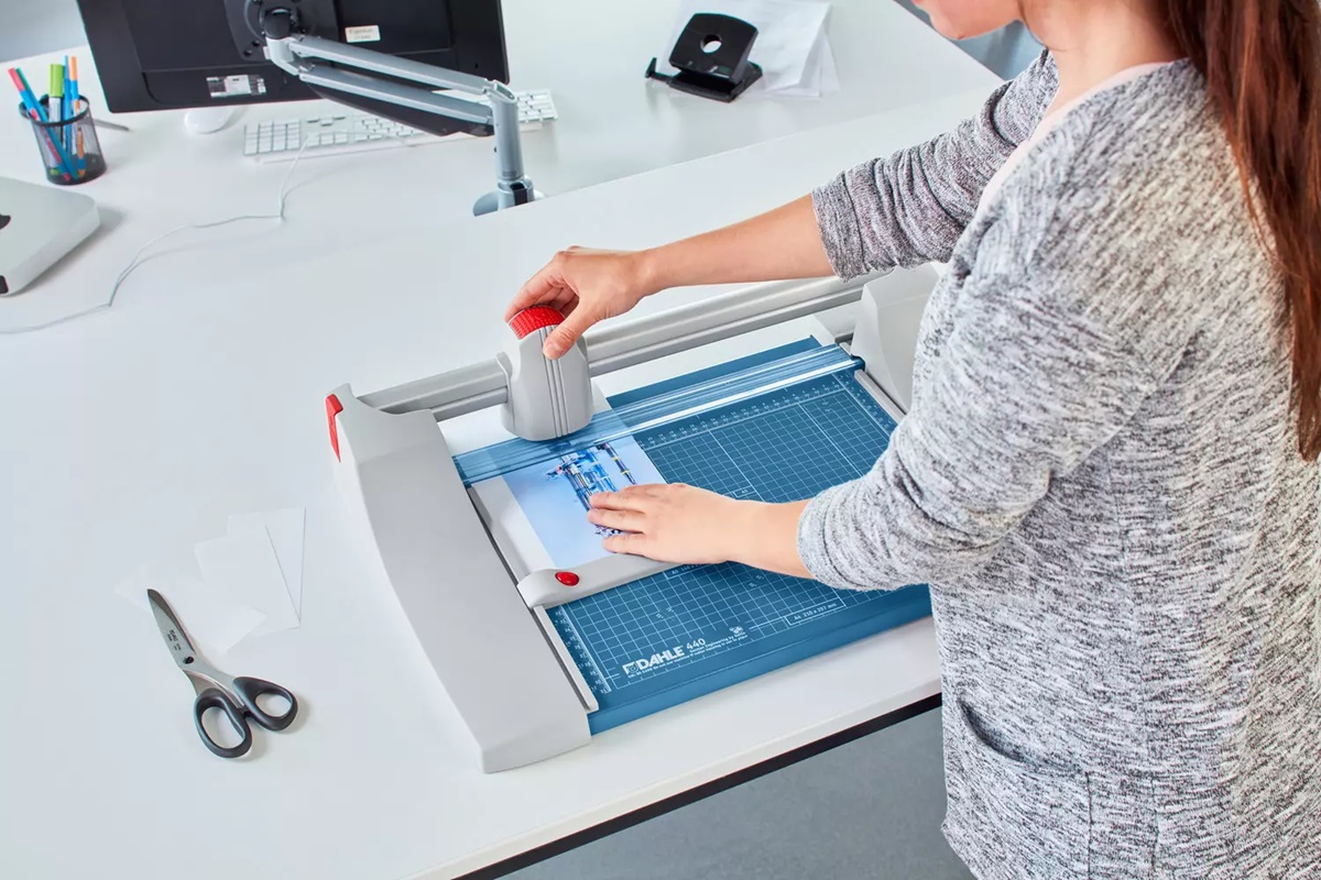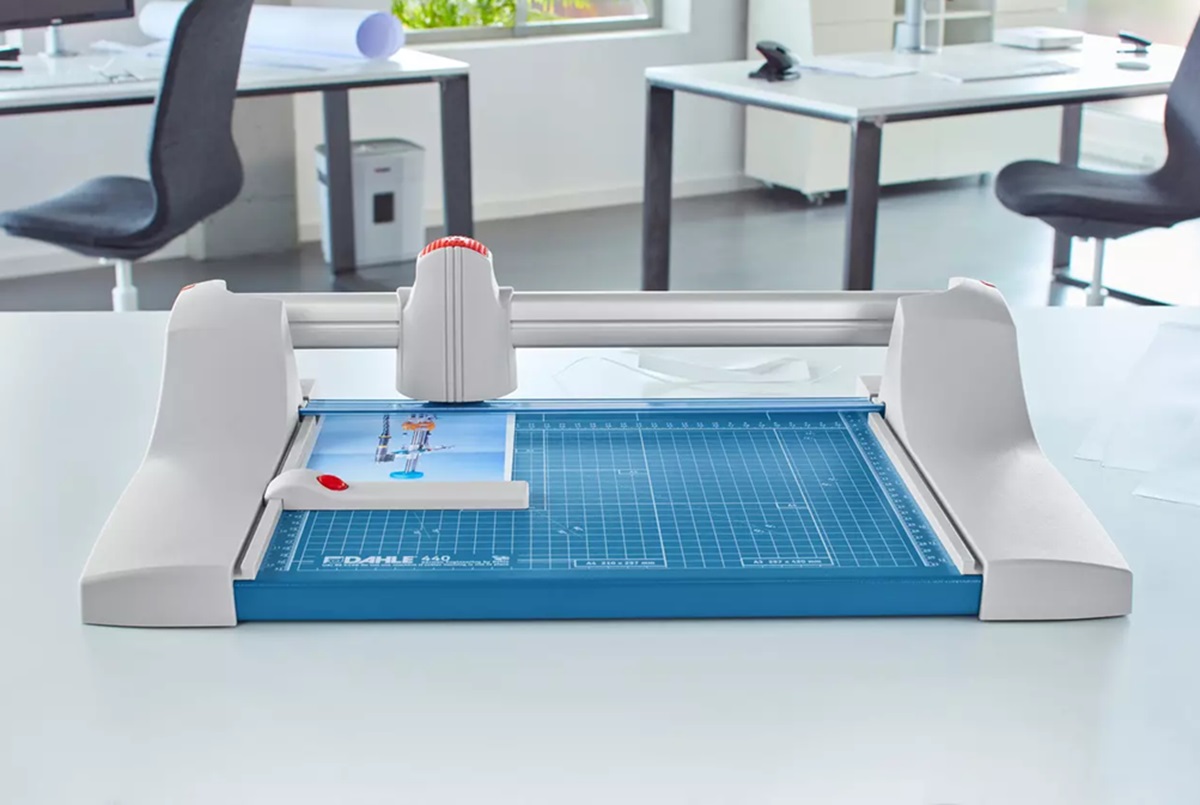 Profesionálna rezačka so stabilnou kovovou základňou s protišmykovými gumenými nožičkami pre bezpečné udržanie rotačného rezača na mieste a presným rezom na grafické účely (filmy, fólie, papier). Kvalita na dosiahnutie najvyššej presnosti – automatický prítlak pohybom rezacej hlavy, nastaviteľný zadný doraz s použitím na oba boky, množstvo zakreslených orientačných DIN formátov. Kruhový nôž umiestnený v plastovom ochrannom kryte sa automaticky brúsi pri rezaní o protinôž (oba nože z tvrdenej ocele). Mierka v cm/inch. Možnosť montáže na stenu.