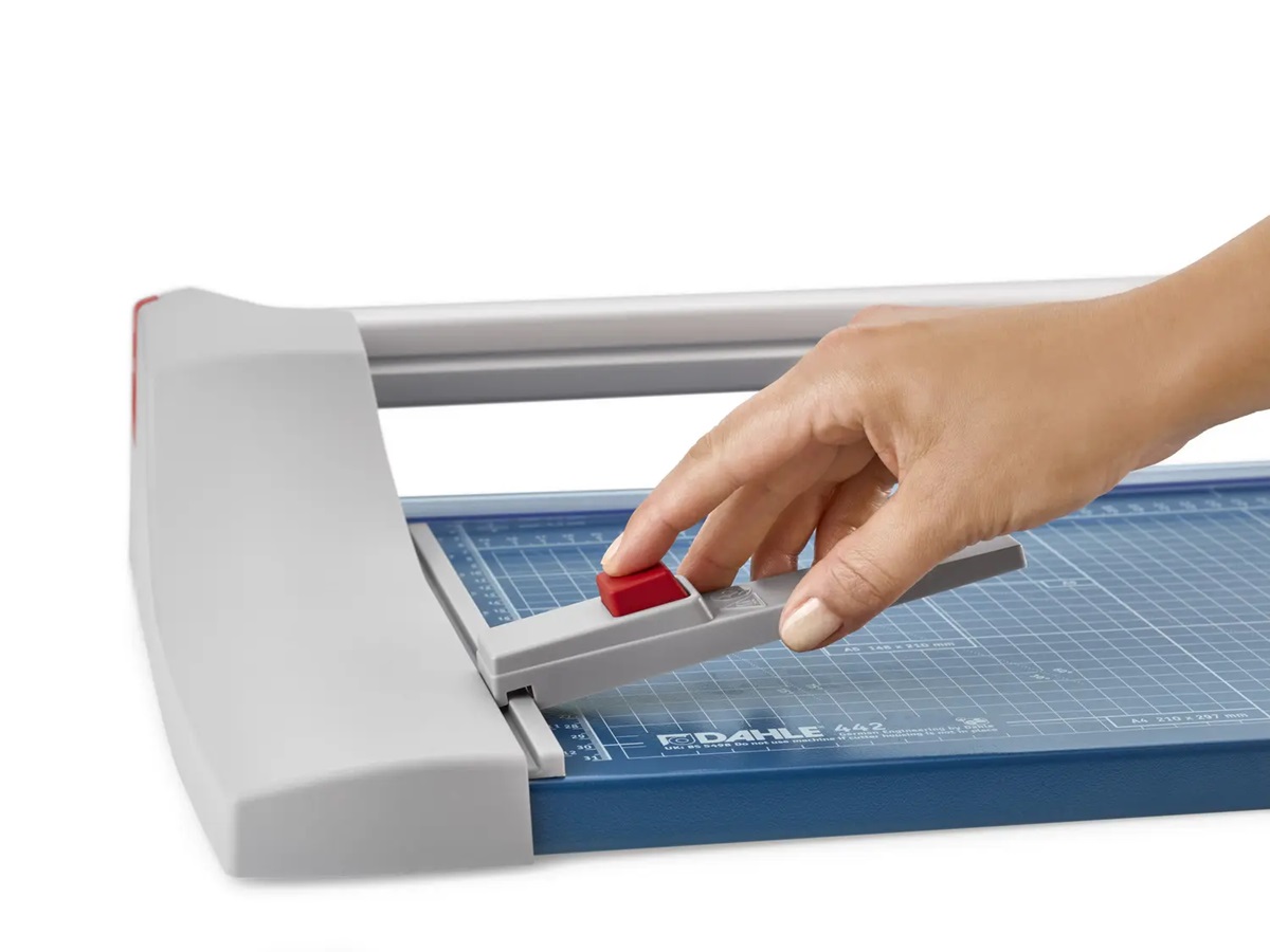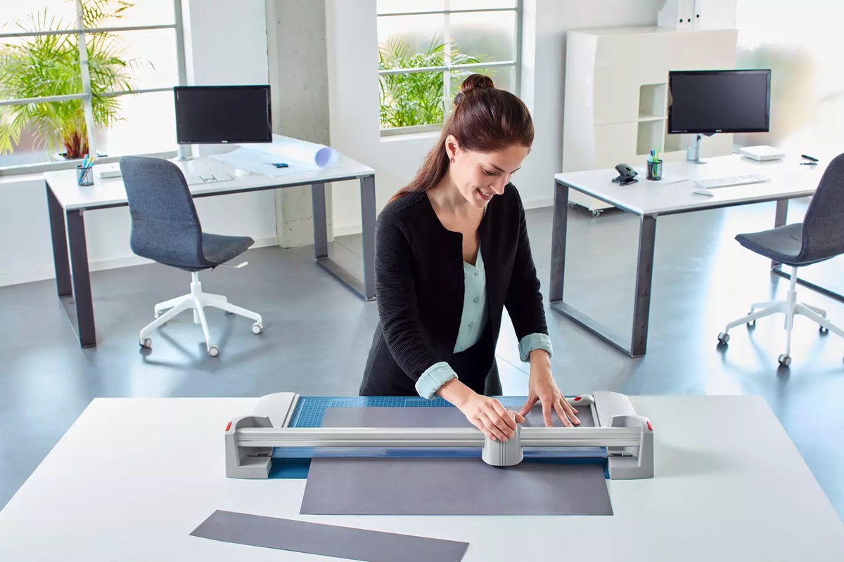 Užitočné formátovacie čiary na základni s milimetrovým delením pozdĺž reznej hrany uľahčujú zarovnanie rezaného materiálu. Kvalita na dosiahnutie najvyššej presnosti – automatický prítlak pohybom rezacej hlavy, nastaviteľný zadný doraz s použitím na oba boky, množstvo zakreslených orientačných DIN formátov. Kruhový nôž umiestnený v plastovom ochrannom kryte sa automaticky brúsi pri rezaní o protinôž (oba nože z tvrdenej ocele). Mierka v cm/inch. Možnosť montáže na stenu.