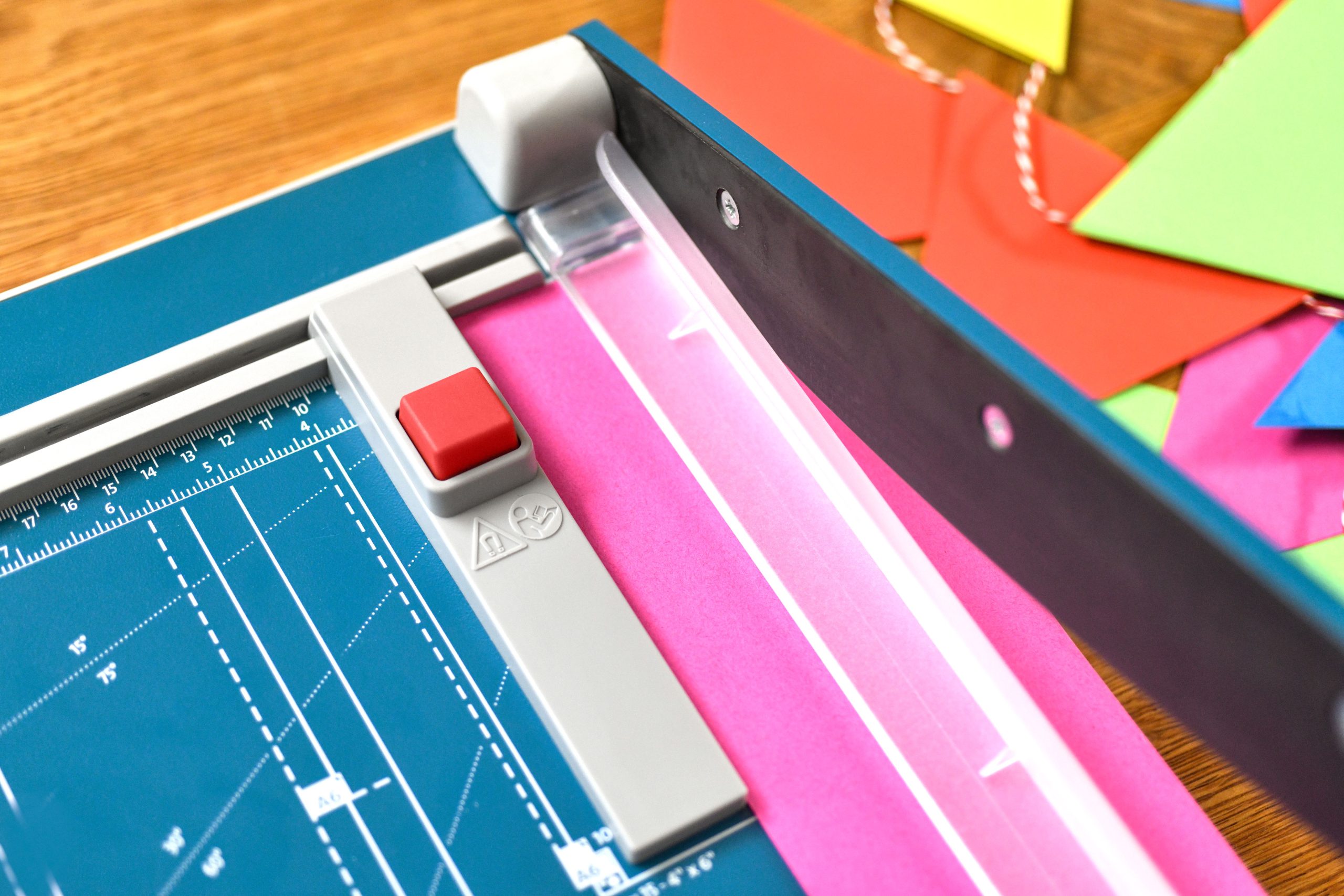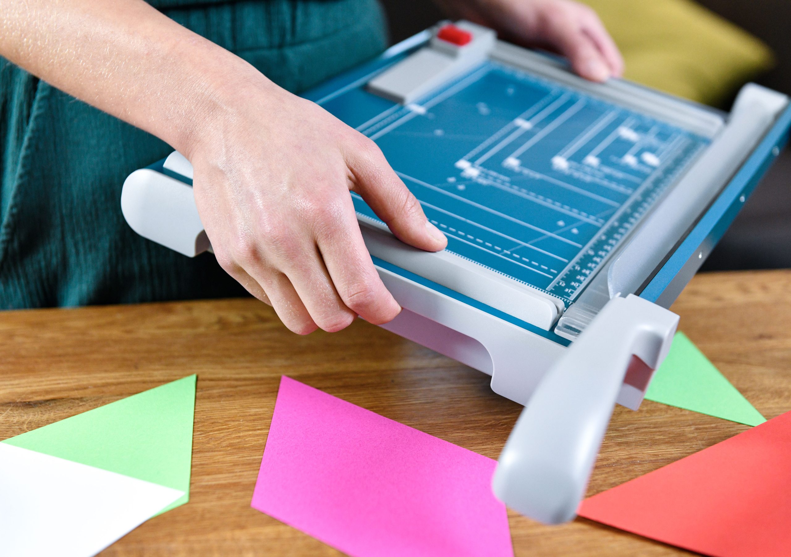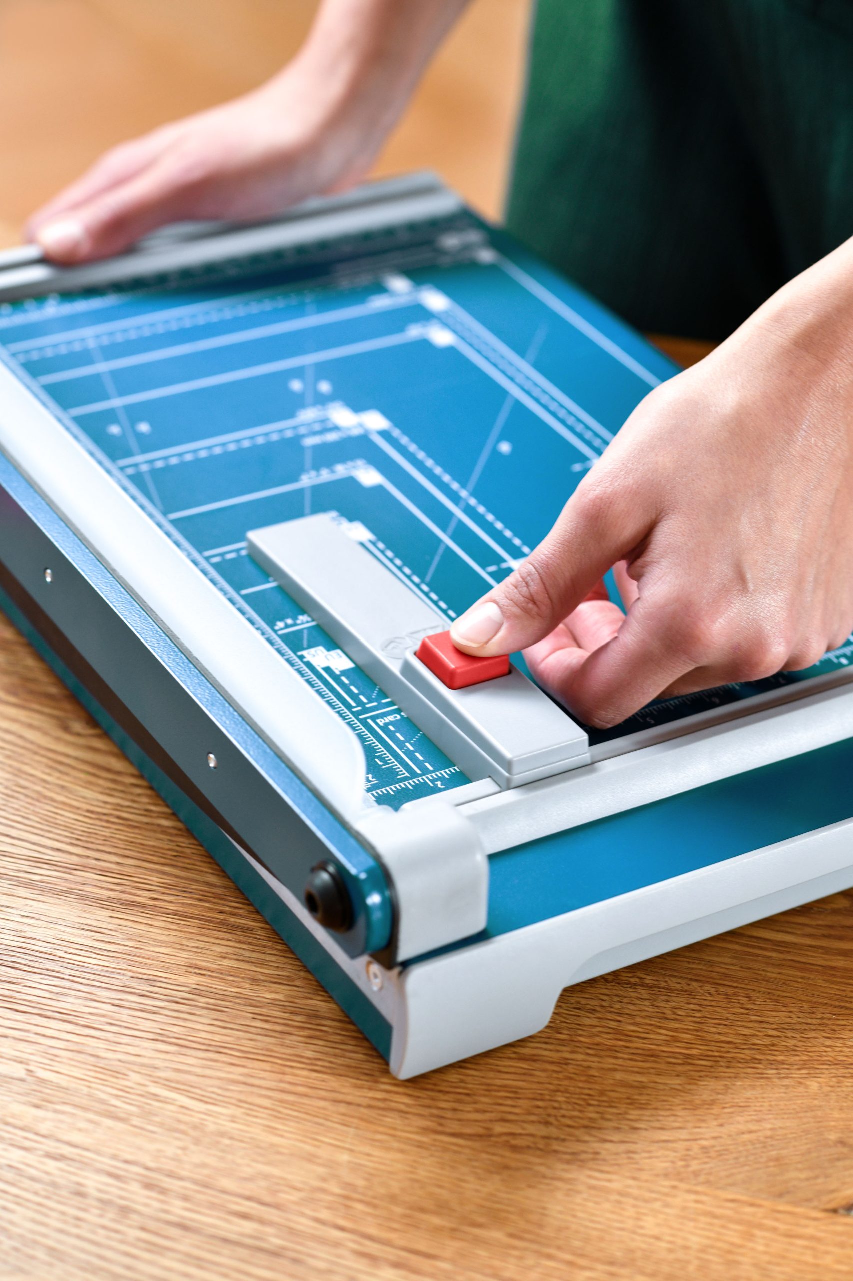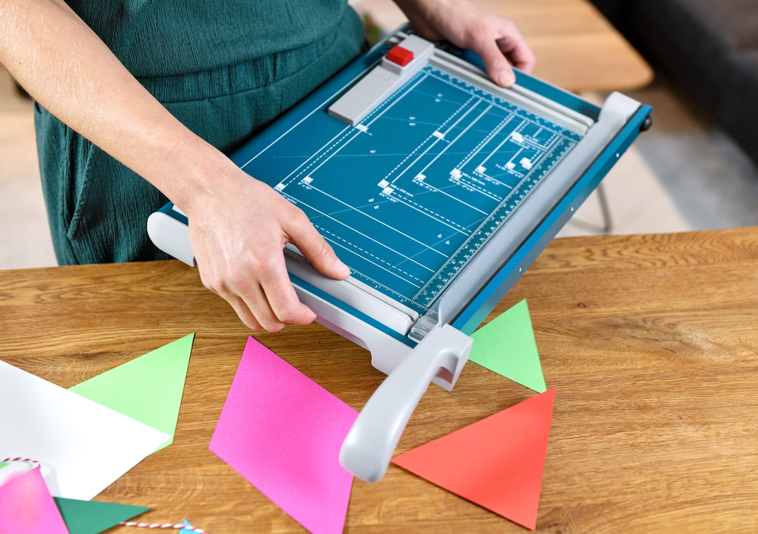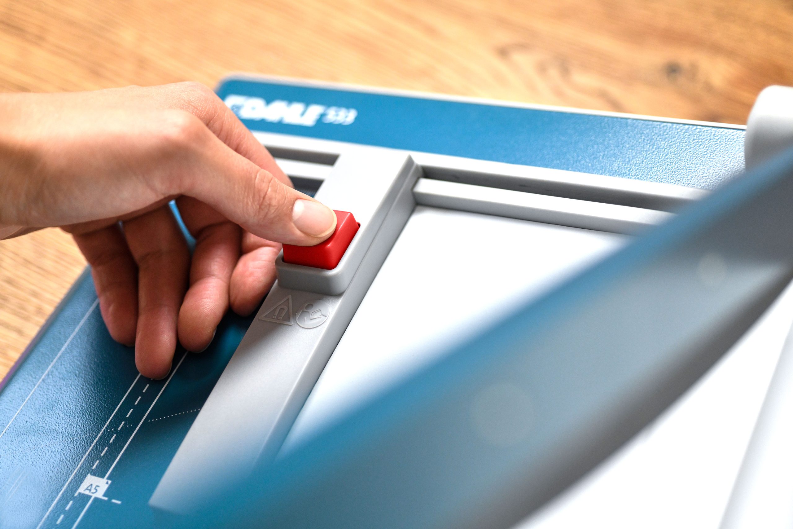 Rezačka z pevného oceľového plechu vhodná na rezanie papiera, kartónu, kože, plastu. Vrchný a spodný rovný nôž vyrobený z kvalitnej nožiarskej ocele Solingen, ručný prítlak s ochranu na prsty. Presná mierka v cm a DIN formátoch, zadný doraz, na spodnej časti výrezy na pohodlné prenášanie.