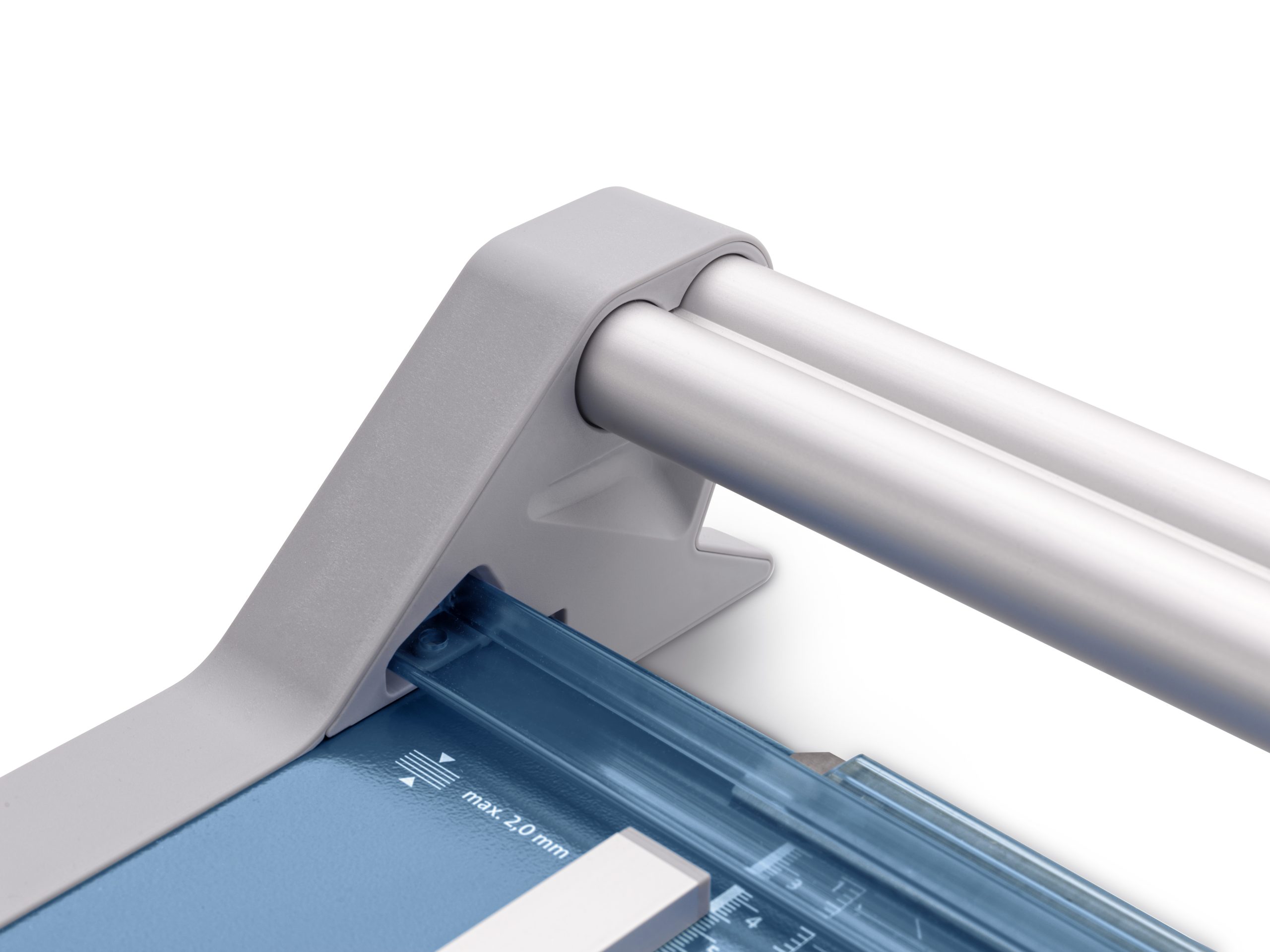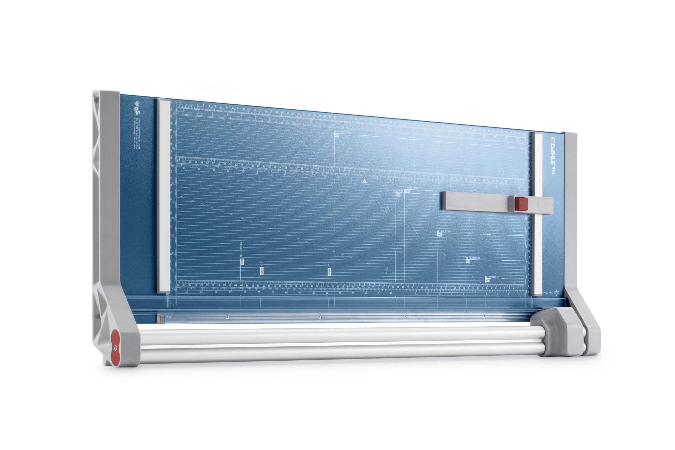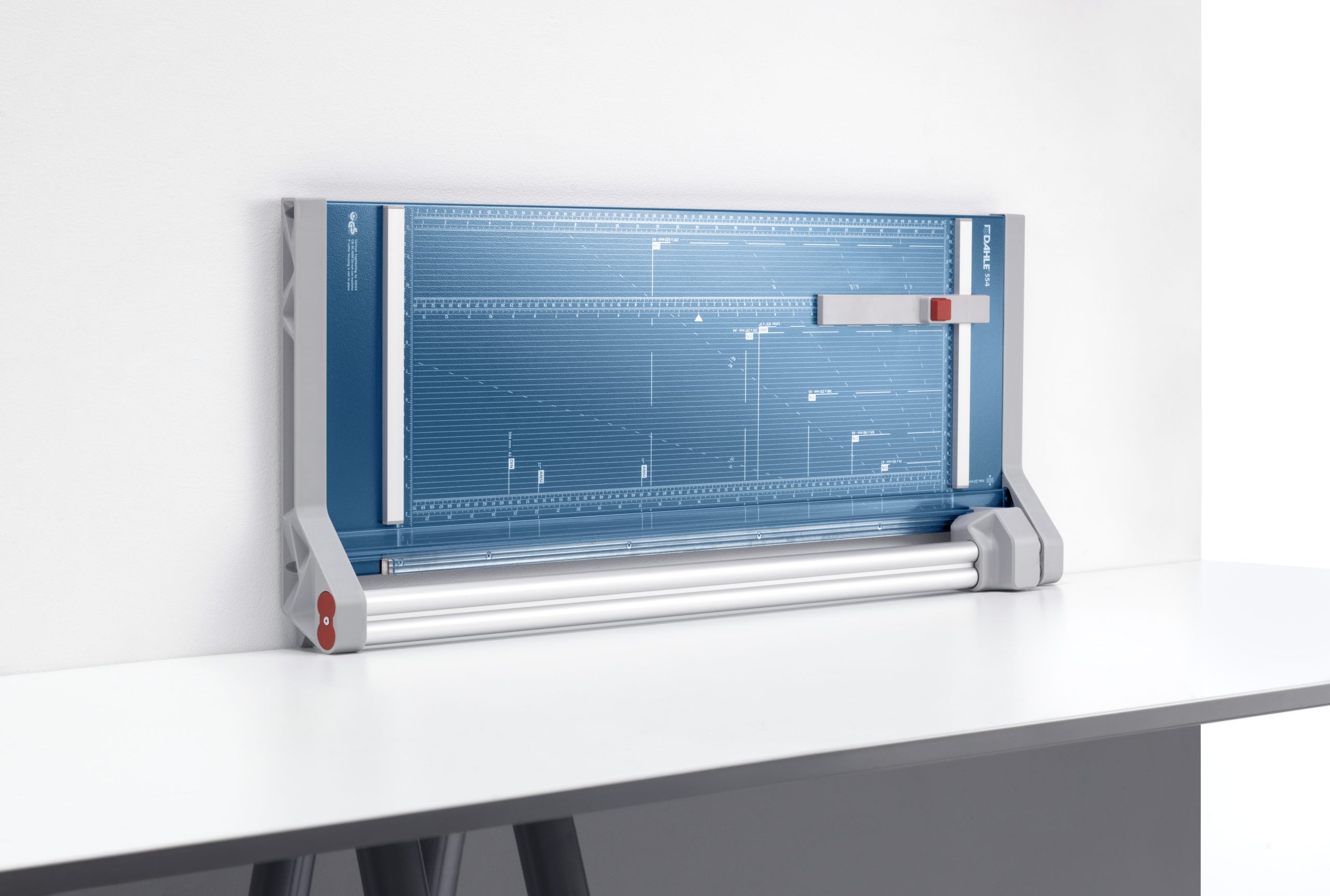 Profesionálna rezačka s kovovou základňou a presným rezom na grafické účely (filmy, fólie, papier). Kruhový nôž umiestnený v plastovom ochrannom kryte sa automaticky brúsi pri rezaní o protinôž – oba nože z tvrdenej ocele. Automatický prítlak pohybom rezacej hlavy, zadný doraz. Mierka v cm/inch. Na pracovnom stole sú vyznačené formáty DIN. Možnosť montáže na stenu.