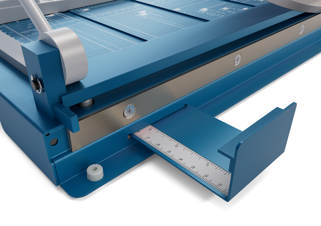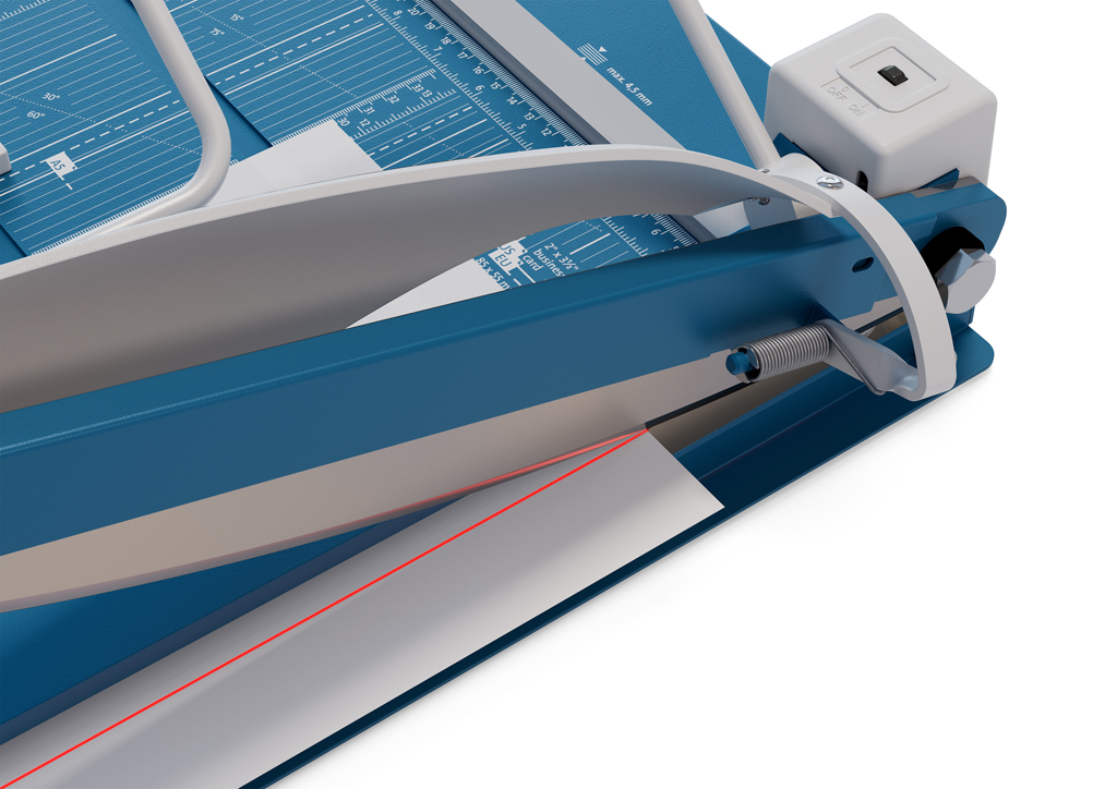 Protišmyková, pohodlná a presná páková rezačka s kovovou základňou na rezanie papiera, kartónu, kože, plastu. Inovovaná technológia s laserovým lúčom, indikujúcim reznú líniu. Brúsený vrchný a spodný nôž z kvalitnej nožiarskej ocele Solingen, rotujúci kryt okolo ostria. Stabilný stôl z masívneho kovu so zaoblenými hranami a protišmykovými gumenými nožičkami pre pevné postavenie. Formátovacie čiary na stole pre lepšie zarovnanie materiálov s praktickou mm stupnicou pozdĺž reznej hrany. Presná mierka v cm/inch a DIN formátoch. Výrez na spodnej časti na pohodlné prenášanie. Presný indikátor laserového lúča pre profesionálne výsledky rezania.