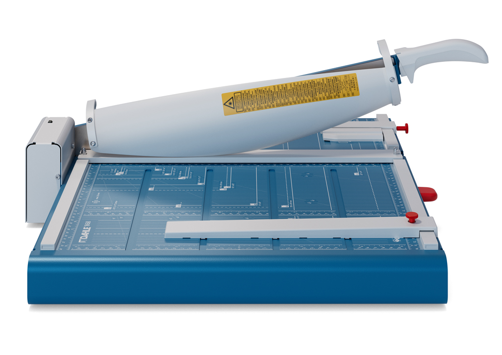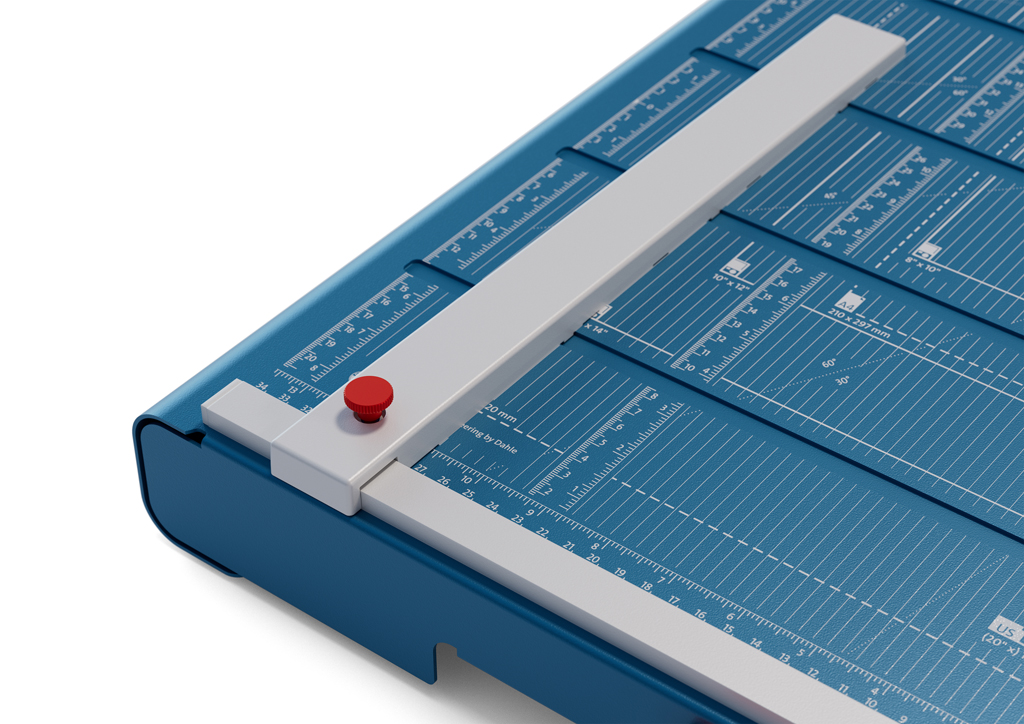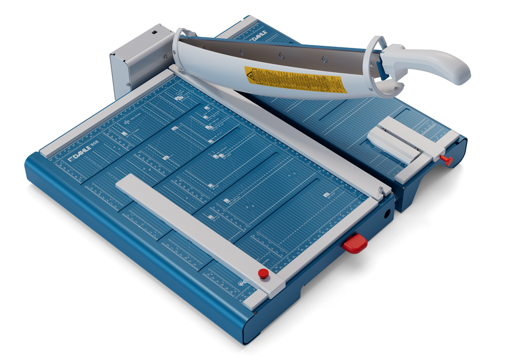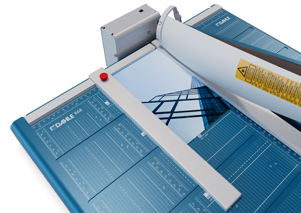 Páková rezačka z pevného oceľového plechu. Základný vrchný a základný spodný brúsený nôž vyrobený z kvalitnej nožiarskej ocele Solingen. Rotujúci kryt okolo ostria chráni prsty pred náhodným porezaním. Presná mierka v cm/ inch a DIN formátoch, čiary umožňujúce rezanie uhlových rezov. Automatický prítlak. Výrez na spodnej časti na pohodlné prenášanie. Súčasťou výbavy je podporný stôl so zariadením na rezanie tenkých prúžkov a zariadenie umožňujúce vytvoriť laserový lúč, indikujúci reznú líniu.