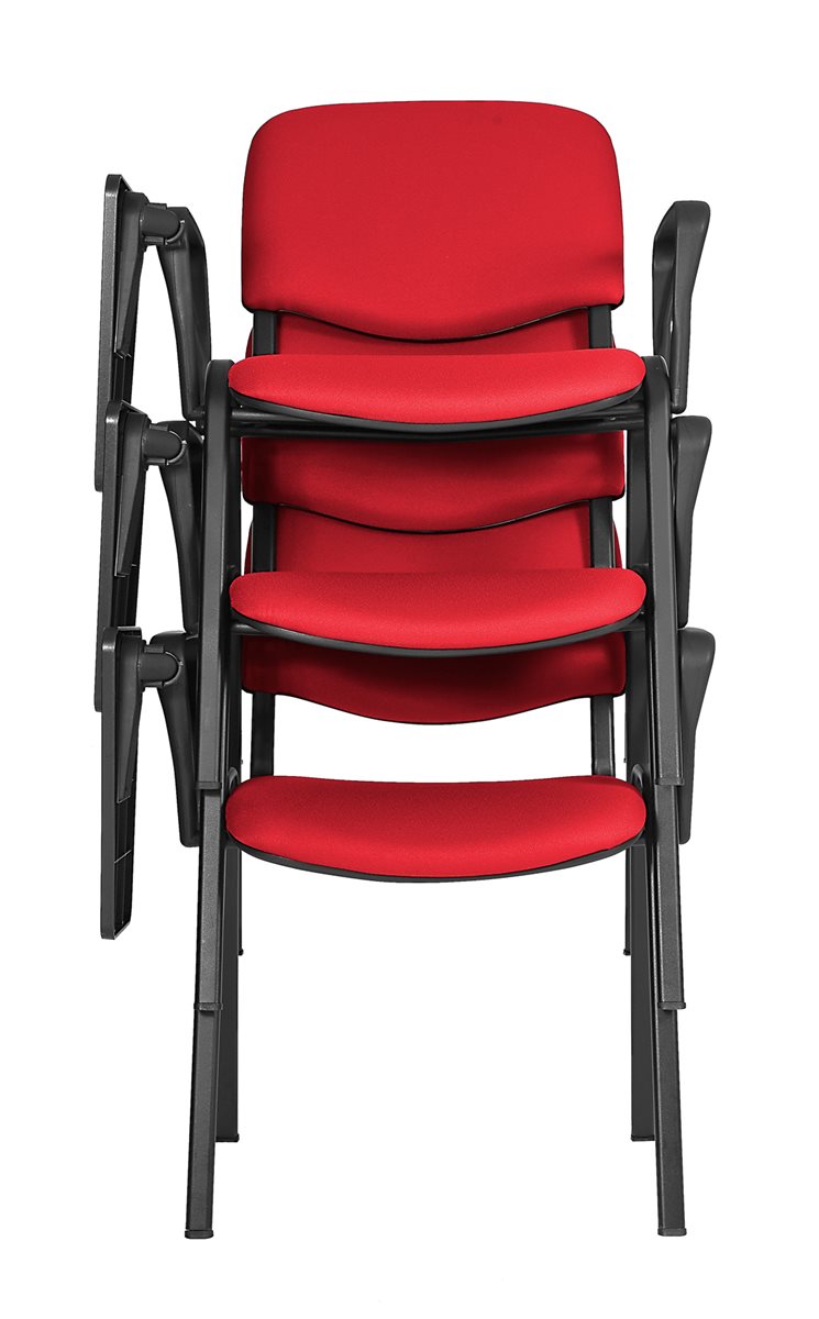 Stohovateľná konferenčná stolička s látkovým poťahom, sedadlo so spodním plastovým krytom.