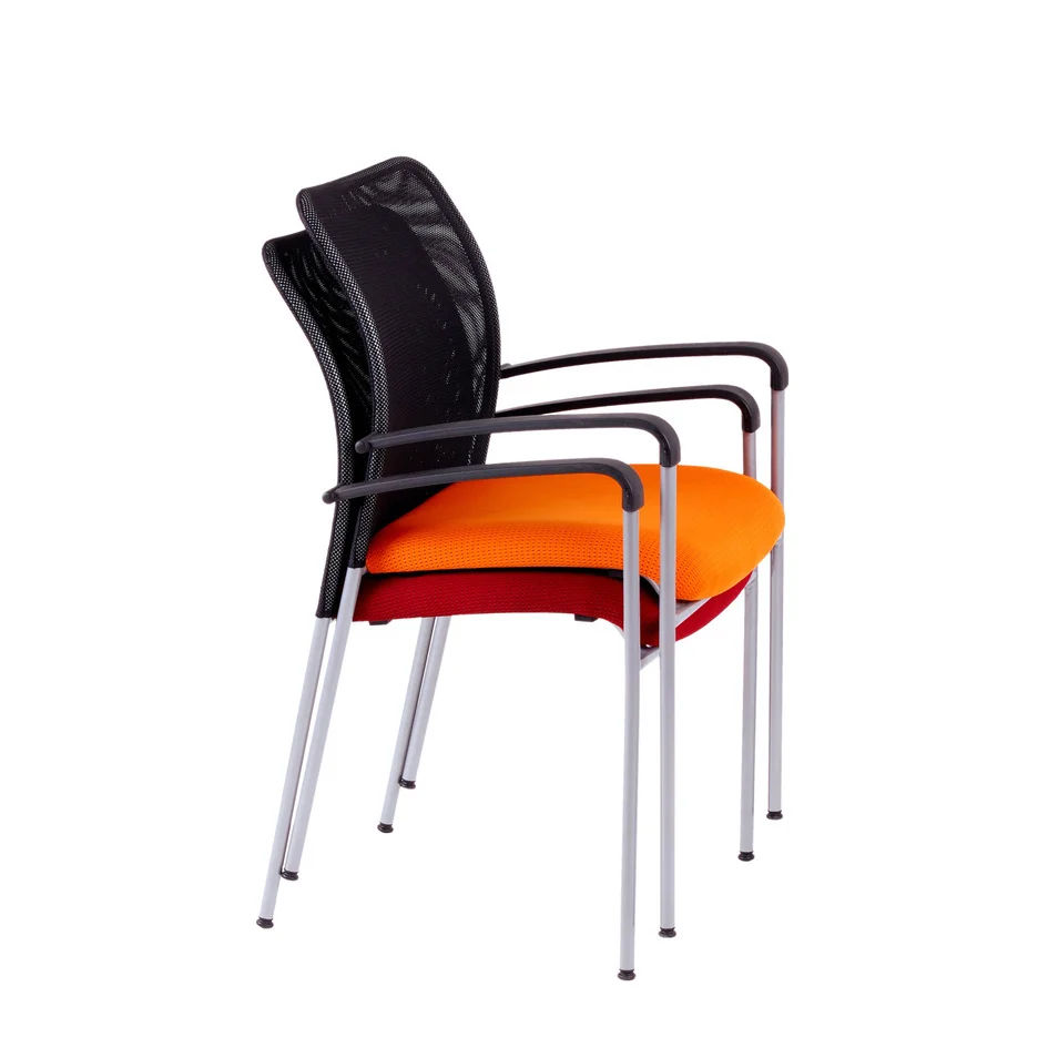 Rokovacia čalúnená stolička so sieťovinovým operadlom.
