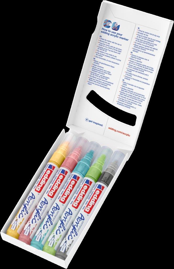 Akrylový popisovač na maľovanie na svetlé alebo tmavé povrchy, ideálny na materiály ako plátno alebo maliarsky papier. Šírka stopy okrúhleho hrotu je 2-3 mm. Vysoko kvalitná pigmentovaná akrylová farba na báze vody je po zaschnutí permanentná, nepriehľadná, svetlostála a bez zápachu. Súprava obsahuje pastelovožltú, pastelovomodrú, pastelovozelenú, klasickú slezovú a antracitovú farbu. Dodávaný v kvalitnom, znovu použiteľnom puzdre. Vhodné náhradné hroty (edding 5100 náhradné hroty) sú dostupné. Sada 5 kusov. Farba pastelový mix.