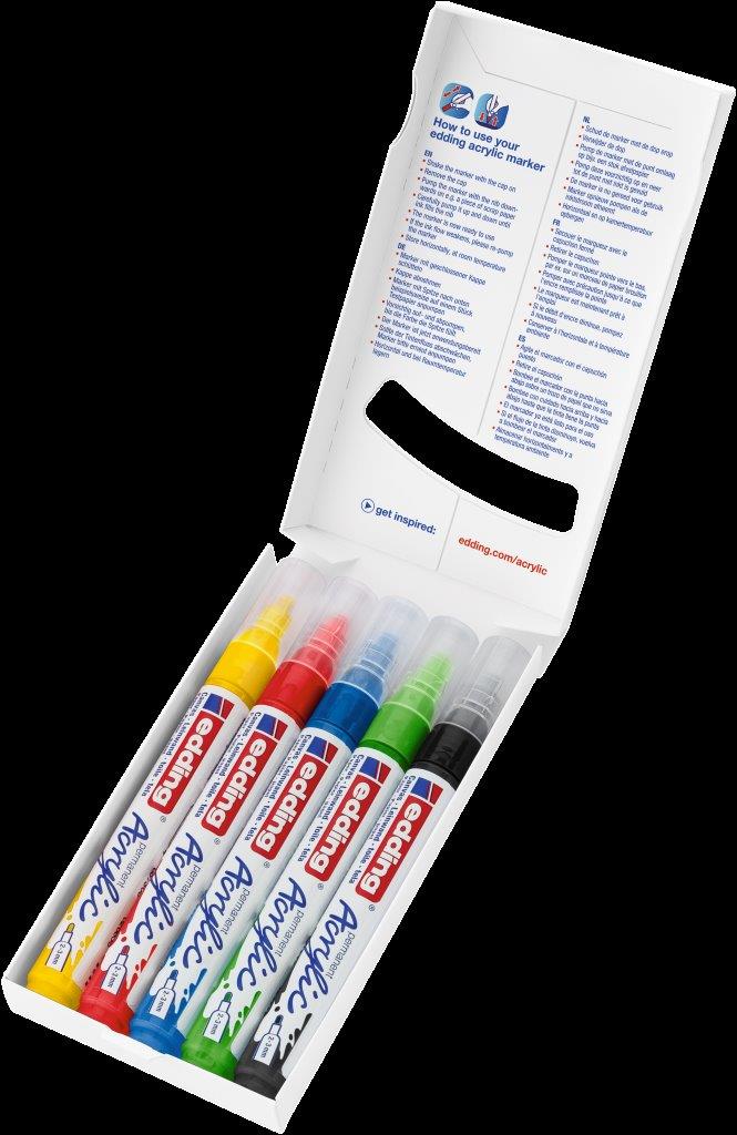 Akrylový popisovač na maľovanie na svetlé alebo tmavé povrchy, ideálny na materiály ako plátno alebo maliarsky papier. Šírka stopy okrúhleho hrotu je 2-3 mm. Vysoko kvalitná pigmentovaná akrylová farba na báze vody je po zaschnutí permanentná, nepriehľadná, svetlostála a bez zápachu. Súprava obsahuje čiernu, dopravnú červenú, enciánovomodrú, dopravnú žltú a žltozelenú farbu. Dodávaný v kvalitnom, znovu použiteľnom puzdre. Vhodné náhradné hroty (edding 5100 náhradné hroty) sú dostupné. Sada 5 kusov. Farba základný mix.