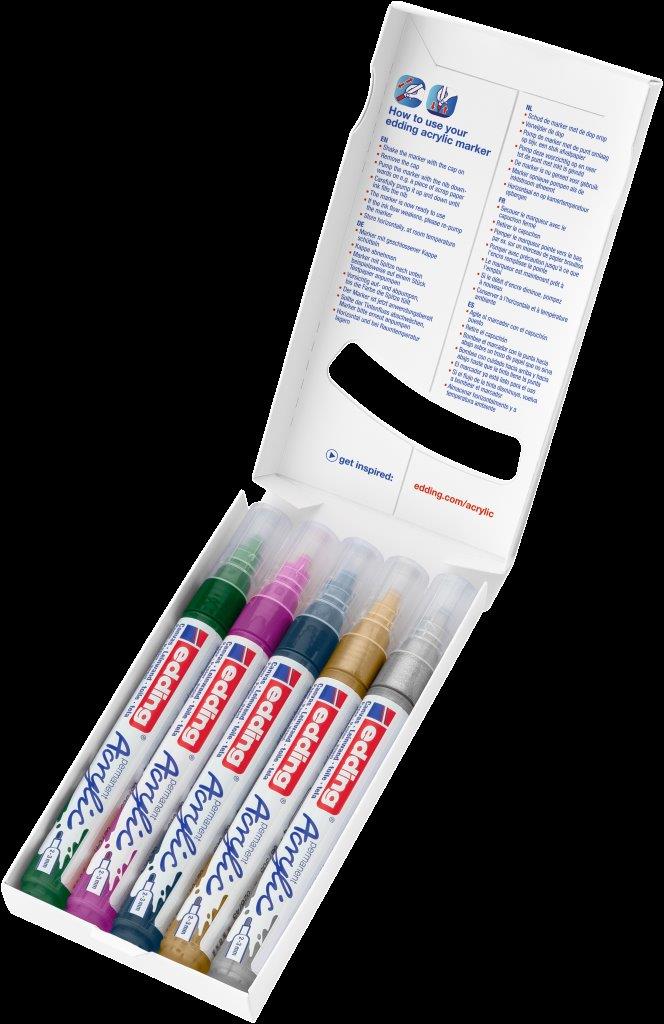 Akrylový popisovač na maľovanie na svetlé alebo tmavé povrchy, ideálny na materiály ako plátno alebo maliarsky papier. Šírka stopy okrúhleho hrotu je 2-3 mm. Vysoko kvalitná pigmentovaná akrylová farba na báze vody je po zaschnutí permanentná, nepriehľadná, svetlostála a bez zápachu. Súprava obsahuje machovozelenú, purpurovú, elegantnú nočnú modrú, zlatú a striebornú farbu. Dodávaný v kvalitnom, znovu použiteľnom puzdre. Vhodné náhradné hroty (edding 5100 náhradné hroty) sú dostupné. Farba sviatočný mix.